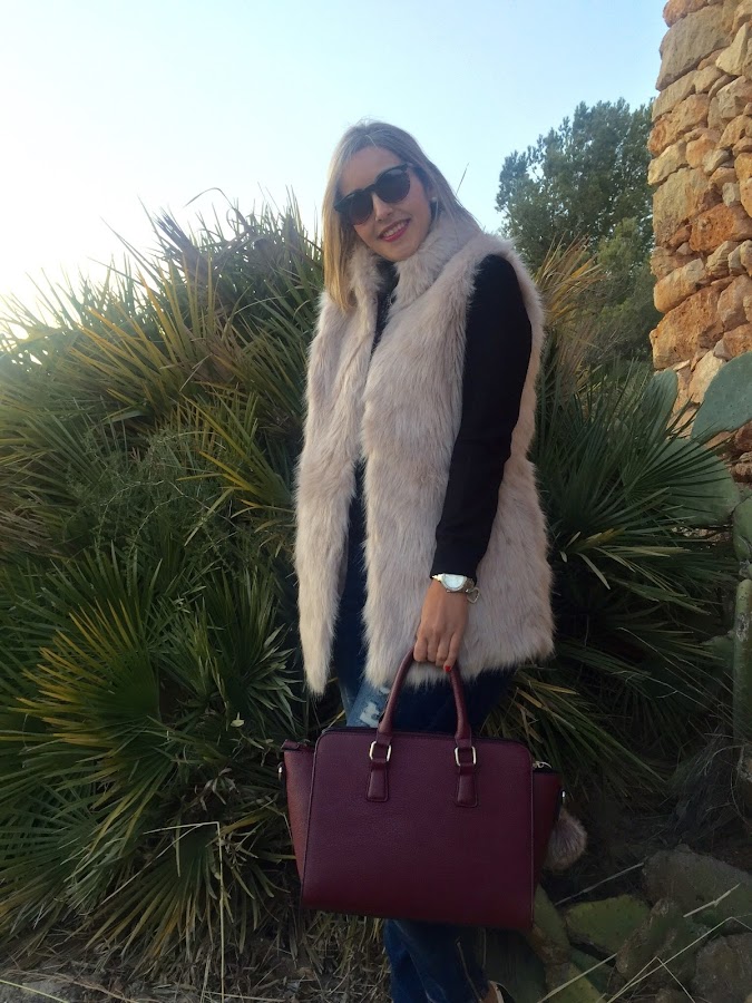 It seems that cold has arrived and it came quickly and without time to get used to the falling of the temperature. Then, we have to dress warmly to go out to the street and I think that furry clothes are the better kind of clothes to do this functionality. In the outfit of the day, I wore my furry vest with a black sweater with high neck and my ripped jeans. The accessories of the outfit were my new shoes similar to the Valentinos ones, a burgundy bag and a burgundy boho necklace. A comfy and warm outfit to take cover of the cold of the city.