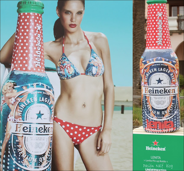 ?Lenita Pin-up Bottle?. Lenita se inspira en la moda de los años 50 y en el universo pin-up para crear un divertido y colorido diseño al más puro American Style. Los lunares y el denim son protagonistas de esta fantasía, en la que con un aire vintage y muy retro figura una pin-up con un catalejo y uno de los bikinis que desfilarán por la pasarela del Swimwear Fashion Show de Gran Canaria Moda Cálida este verano de la mano de Lenita, que con su colección 2015 cumplirá 30 años. De ahí que el mensaje estampado en la etiqueta sea su slogan cumpleañero: "Loving Beachwear since 1985".