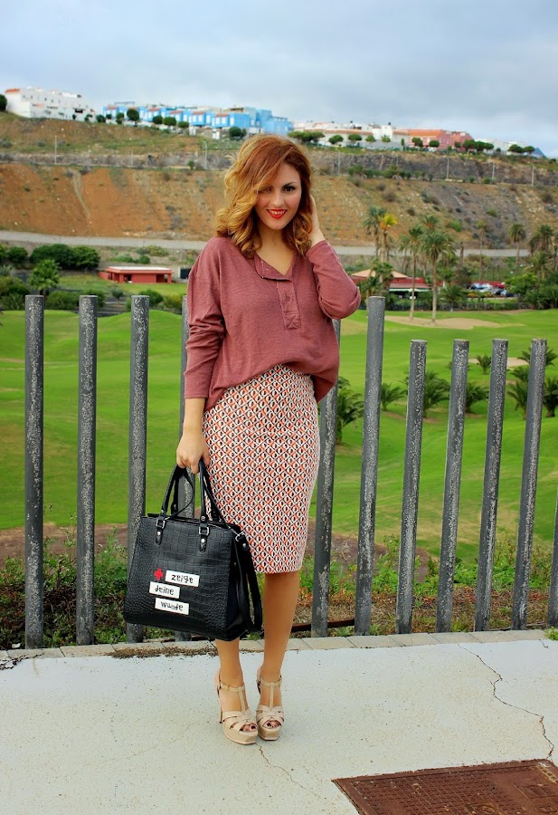 Mi nueva adquisición, FALDA MINI JACQUARD de tubo, su estampado geométrico me enamoró me recuerda a las de mi abuela muy de cuéntame jiji... se vino a casa y super contenta con el juego que puede dar. Sus colores no son muy habituales en mi armario.