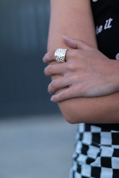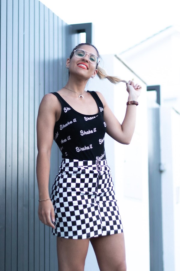 Como sabéis, uno de los estampados tendencia de este año son los cuadros. Aquellos que se parecen a un tablero de ajedrez. Y yo he decido jugar y cantar jaque mate con mi nueva falda de SHEIN. Me encanta como queda, ya que se adapta como un guante y además es un poco elástica por lo que no aprieta nada de nada. Me gusta mucho la cremallera que tiene en la parte delantera con una anilla redonda que, además, adorna muchísimo. La he combinado con un body negro con letras. Es de Pull & Bear del año pasado.