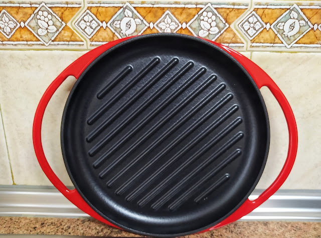Parrilla grill de hierro fundido esmaltado que distribuye de manera perfecta el calor, transmisión rápida de temperatura y además mantiene el calor, es resistente y duradera, con asas laterales perfectas para mover o coger la parrilla, apta para horno y barbacoa y también para todo tipo de cocinas (gas, vitrocerámica e inducción) y es fácil de limpiar. La he utilizado principalmente para hacer la carne a la plancha porque necesita mucho menos cantidad de aceite y así es una forma de comer más saludable, aunque también la usaré para hacer parrillada de verduras ya os contaré qué tal. Encaja a la perfección con el tamaño del fuego así que distribuye muy bien la temperatura y podemos aprovechar totalmente el espacio para freír a la plancha. El único punto negativo para mí es el peso, es una plancha bastante pesada y que a la hora de colocarla en algún sitio o limpiarla pues se hace más complicado.
