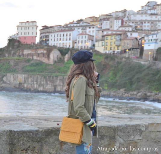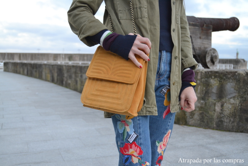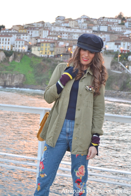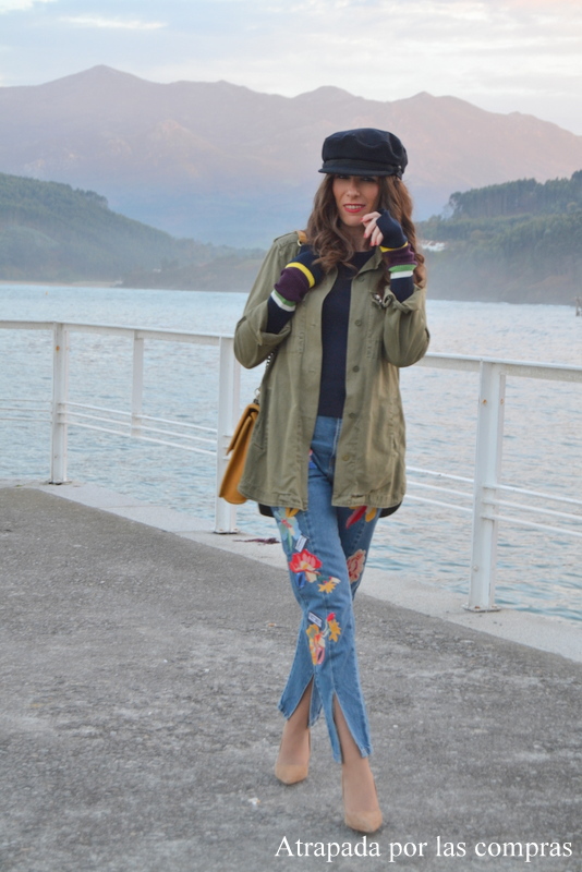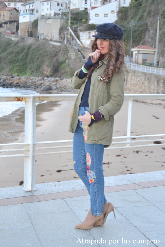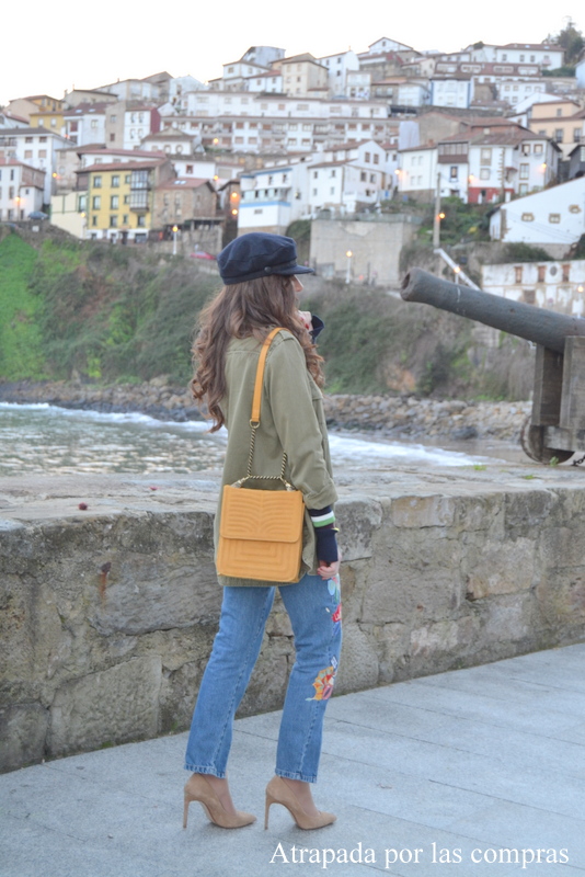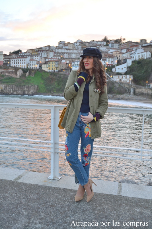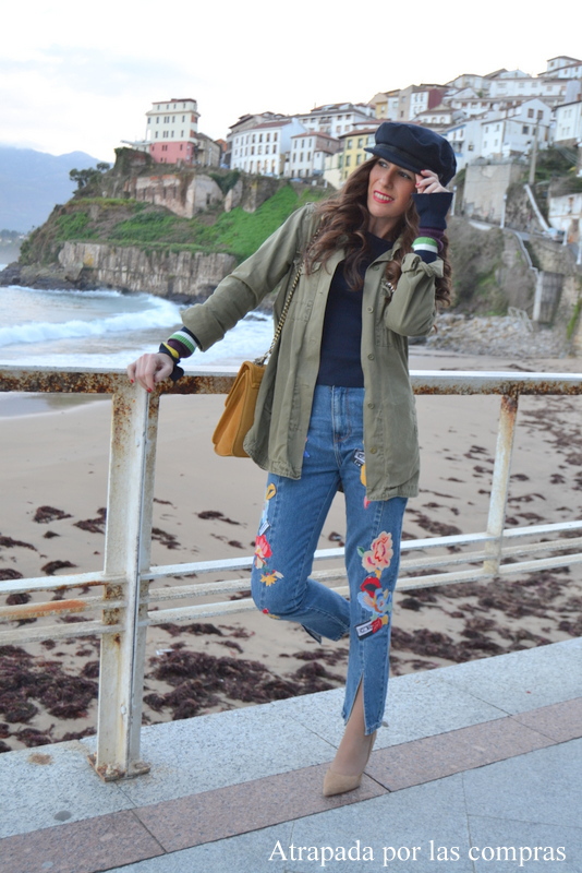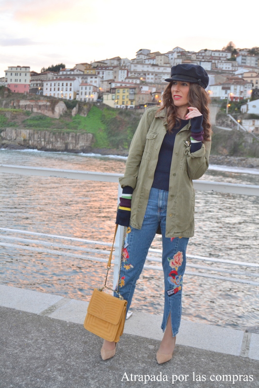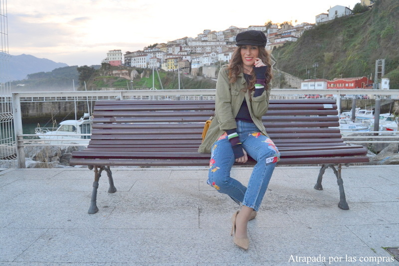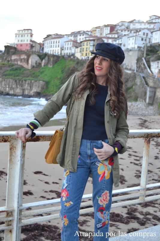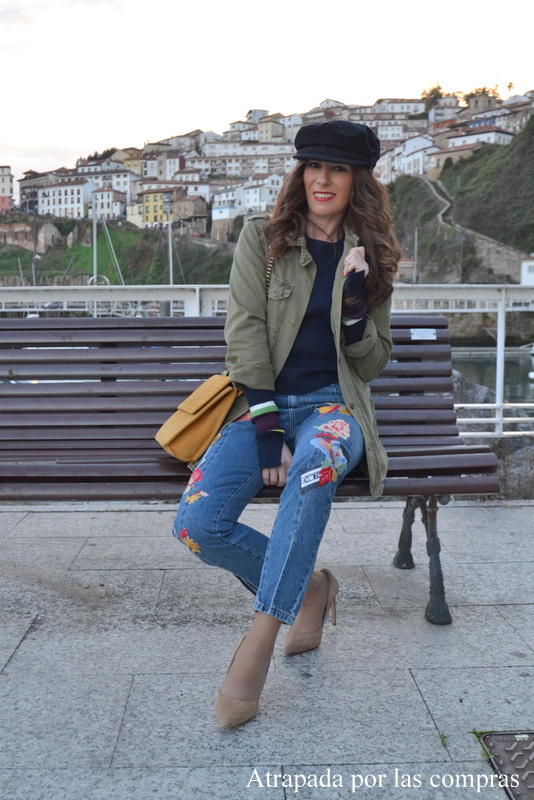 El look que os enseño hoy lo llevé ayer para salir a comer y pasar el día con la family (las fotos están hechas en el Puerto de Lastres) y la verdad que puede pecar de todo menos de aburrido y es que la prenda protagonista son unos funny jeans que me encantaron desde que los vi por primera vez aunque luego tardé en decidirme en comprarlos. Los combiné con un jersey cropped azul marino con mangas extralargas y rayas de colores en los puños y una sobrecamisa militar. Le añadí más color con el bolso, en amarillo, hay igual que algunas de las rayas de las mangas del jersey y color que también llevan los parches. El punto neutral lo puse con el calzado con unos salones nude. Ahhh y la gorra, había perdido mi gorra preferida y este fin de semana encontré ésta, no es negra como la que tenía, es azul marino, pero da igual, me chifla!!