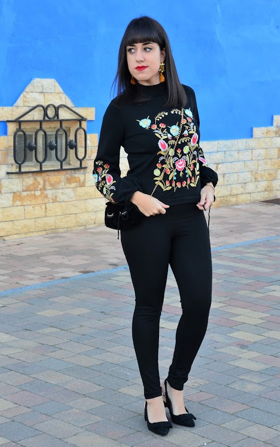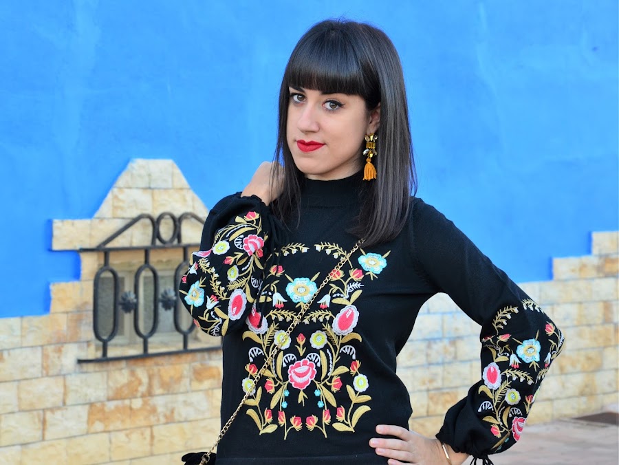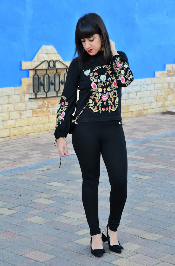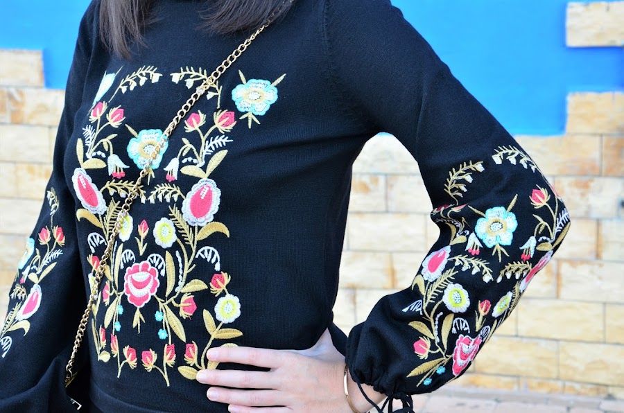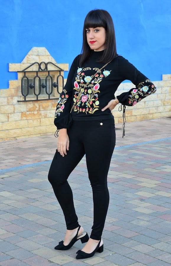 Hoy os enseño un look con jersey bordado y mangas acampanadas que se ajustan con lazada. Es de Zaful, ajustado, super bonito, los bordados son preciosos y también los tiene por la espalda.