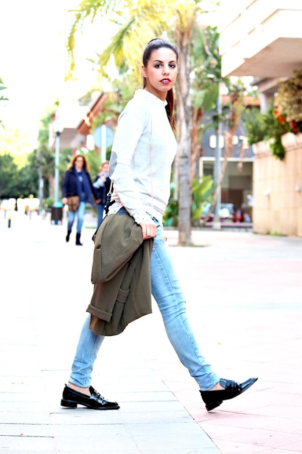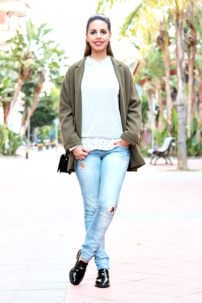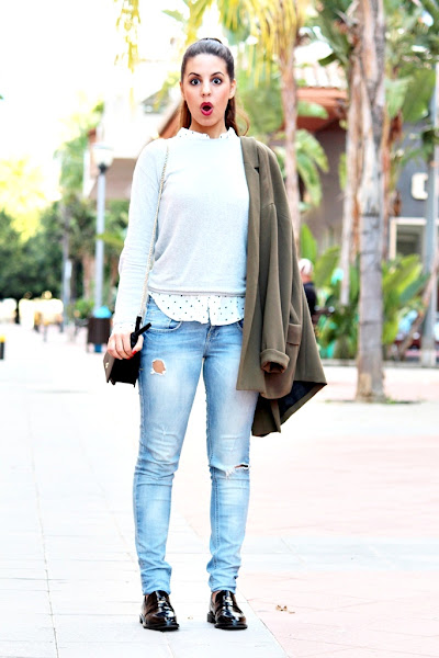 Hoy os enseño un outfit que me encanta. He usado el jersey gris con coderas que os enseñaba en este video y debajo una camisa blanca con topitos y corazones que me compré el año pasado en Springfield aunque en la web hay una muy similar (os dejo el enlace debajo de las fotos) Los jeans son de Bershka, los agujeros eran más pequeños cuando me los compré y mira ya por donde van :( El bolso y los zapatos son de Zara. Ahora si mi gatita me lo permite (porque la tengo encima) voy a seguir editando un video de compritas para que podáis verlo pronto en el canal. #FelizJueves.