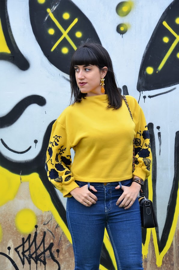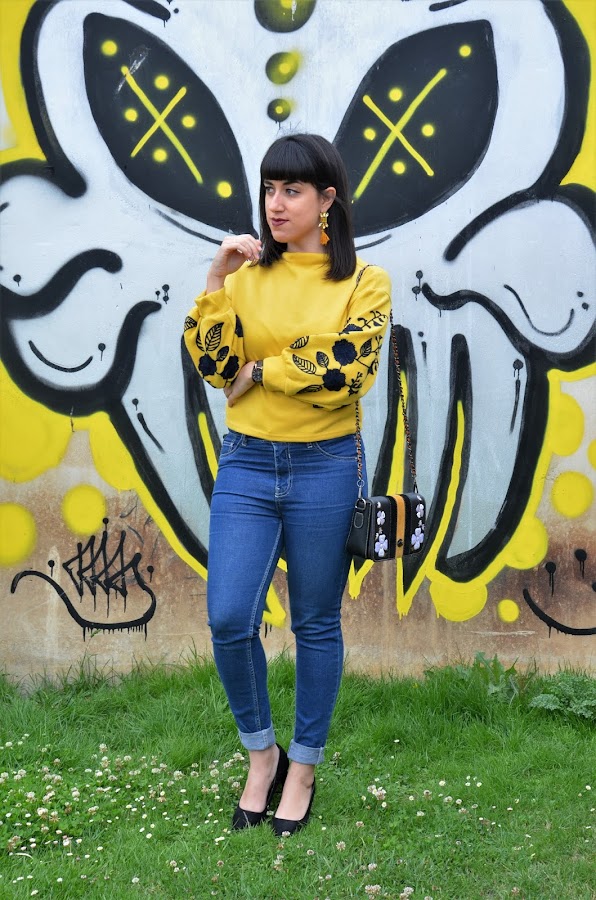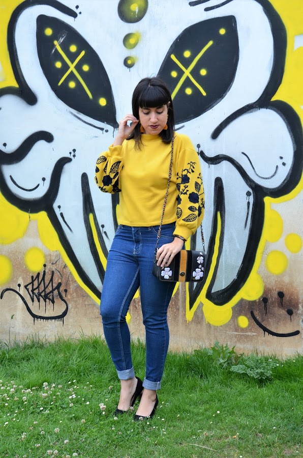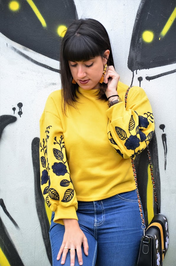 Pero como no hay mal que por bien no venga, aprovecho para enseñaros este original jersey mostaza con mangas de bordados florales de Shein. Es un jersey que ni fino ni gordo, ideal para el entretiempo. Como veis es oversize, y con las mangas farol.