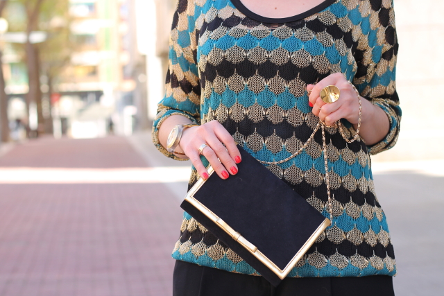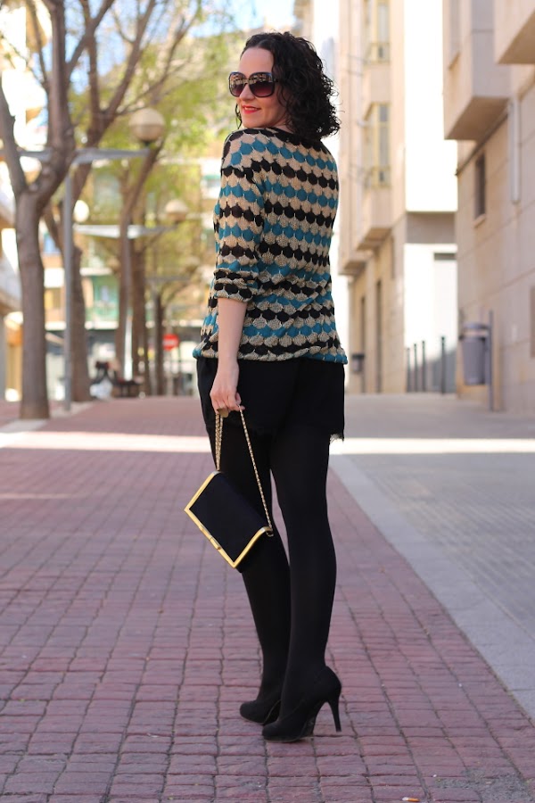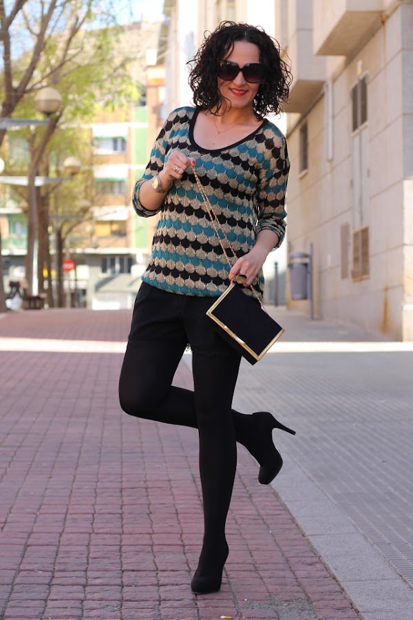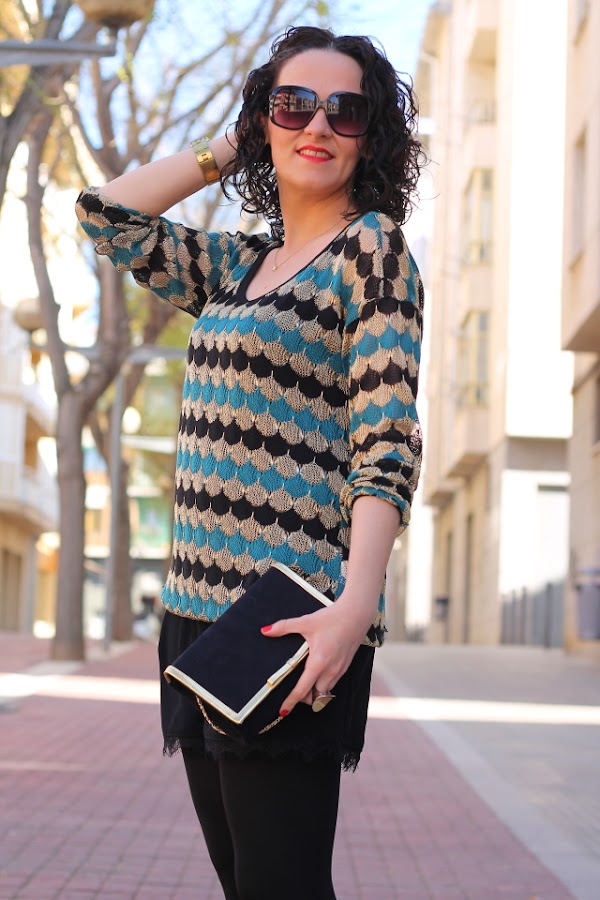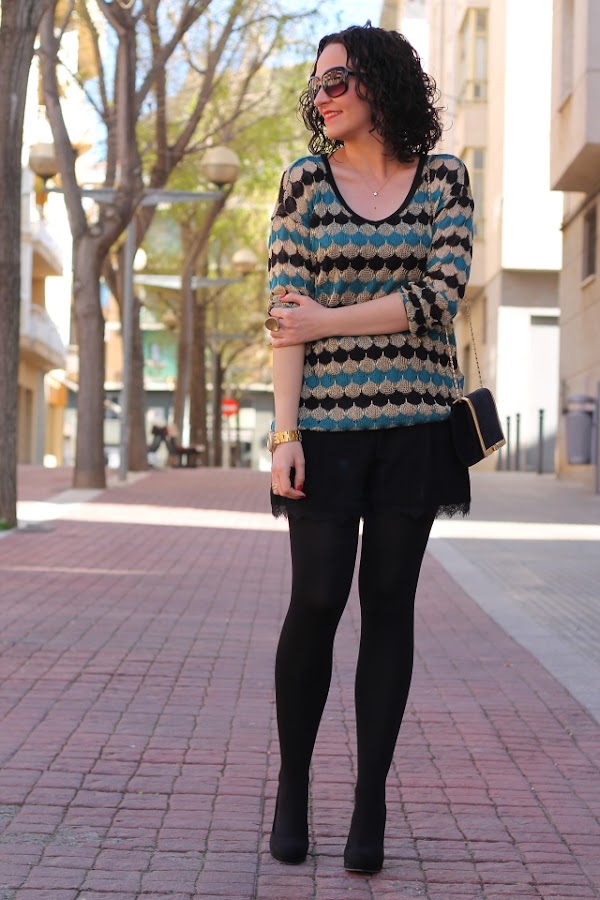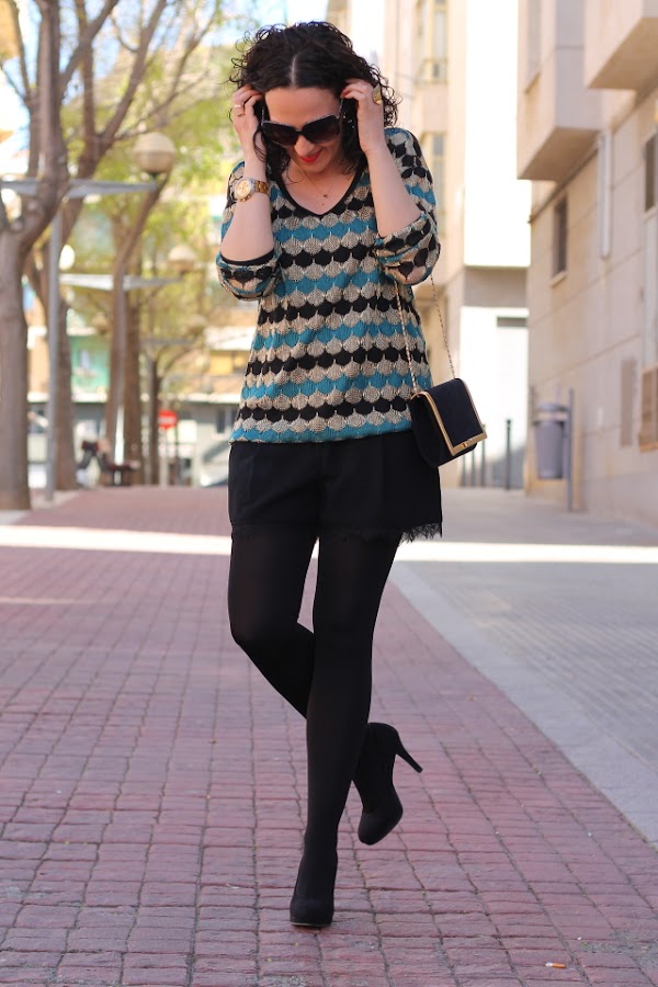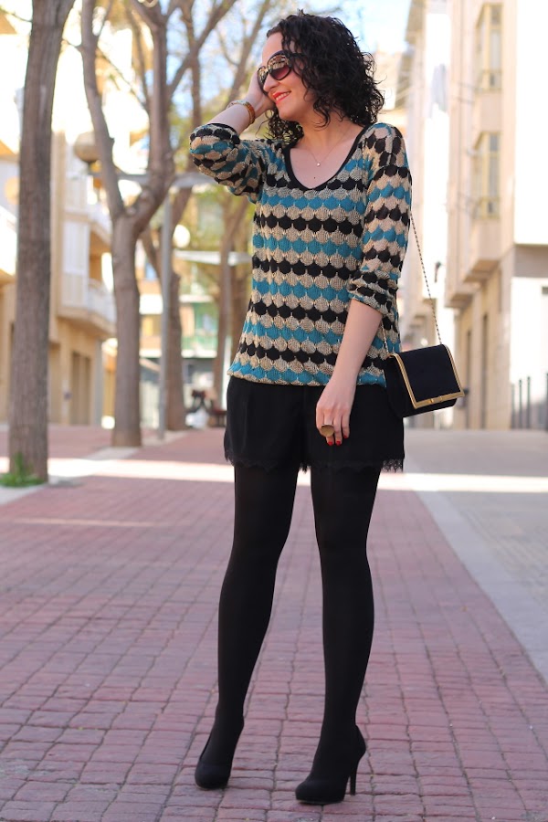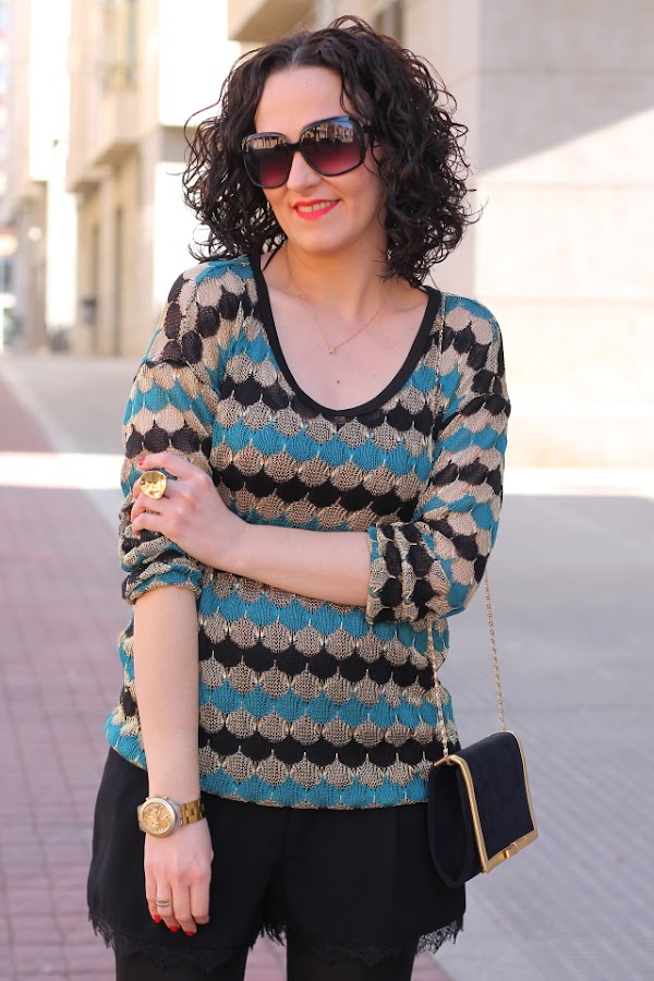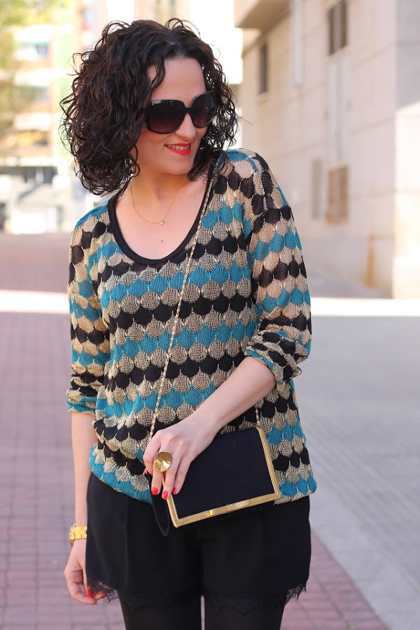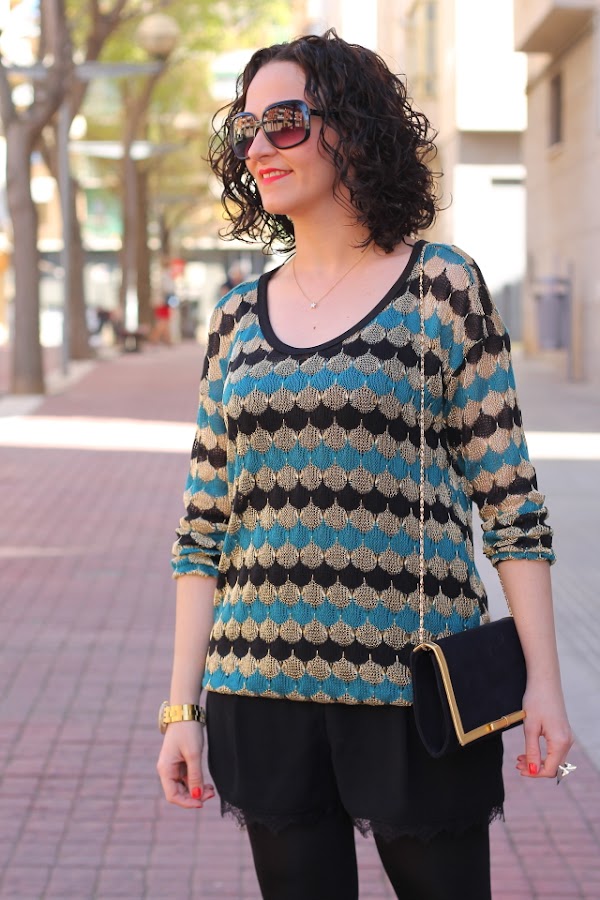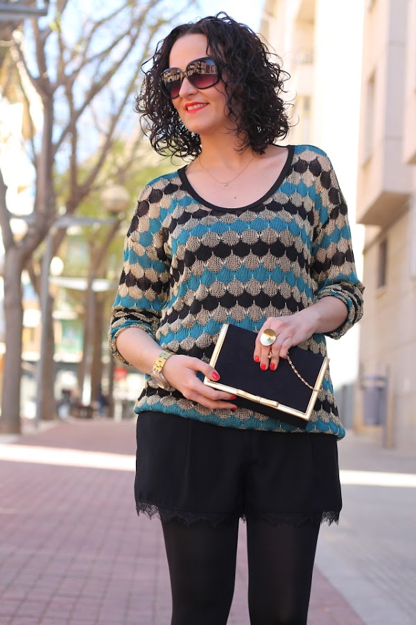 Aunque no vivo en Zaragoza para según que cosas siempre voy allí, como es el caso del dentista. Hace unos días tuve que ir a revisión y llegué con bastante tiempo de adelanto así que tenía dos opciones, o entrar y esperar hasta que me tocase o dar una vueltecilla por las boutiques tan cucas que hay por los alrededores. Supongo que a estas alturas no hace falta que os diga cual fue mi decisión. Una hora más tarde estaba sentada en el sillón del dentista con un nuevo jersey en mi armario. El elegido esta vez fue este jersey de hilo en tonos negro, verde esmeralda y dorado que hoy he combinado con shorts negros con encaje.