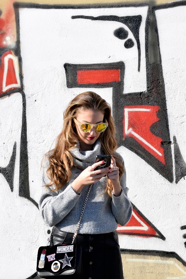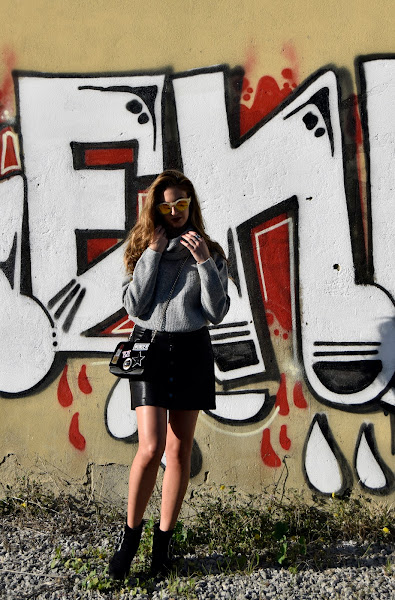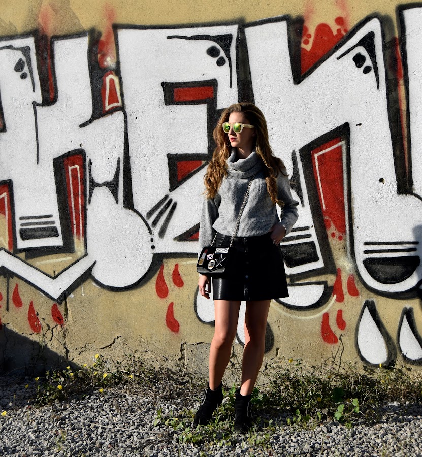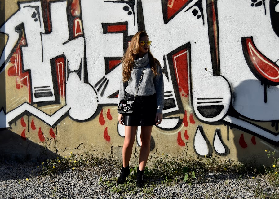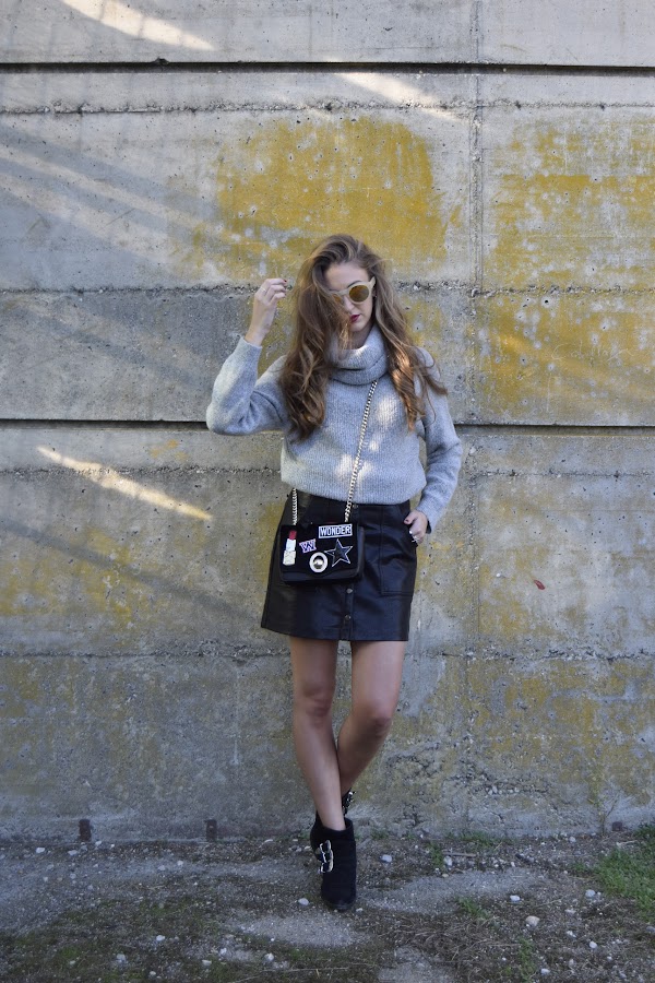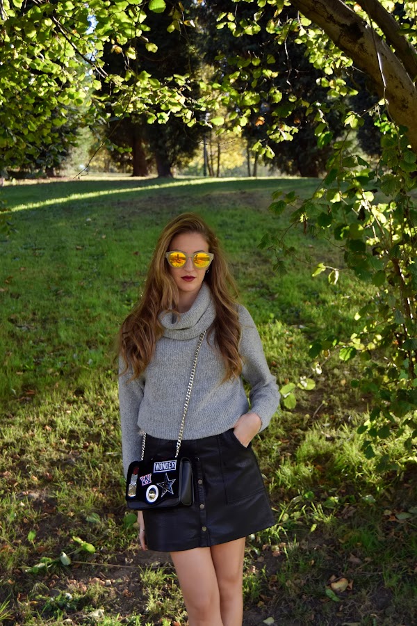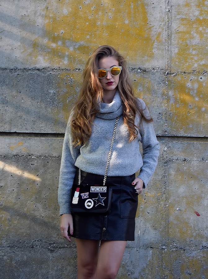 Para ello combiné un jersey gris super amoroso de Mango, con la falda de cuero que ya os enseñe en un anterior post y que me encanta y para darle un toque de color estas gafas de pasta y cristal amarillo de Uterqüe
