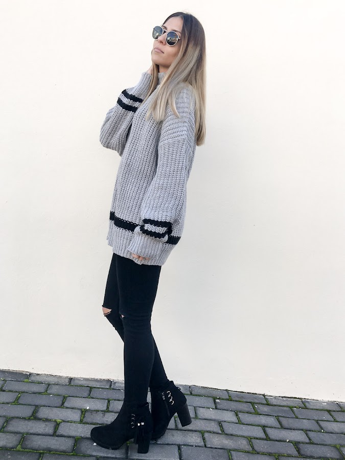 I chose a gray maxi sweater with black stripes on the sleeves and down, wool, very chubby and warm, is perfect for winter !!
