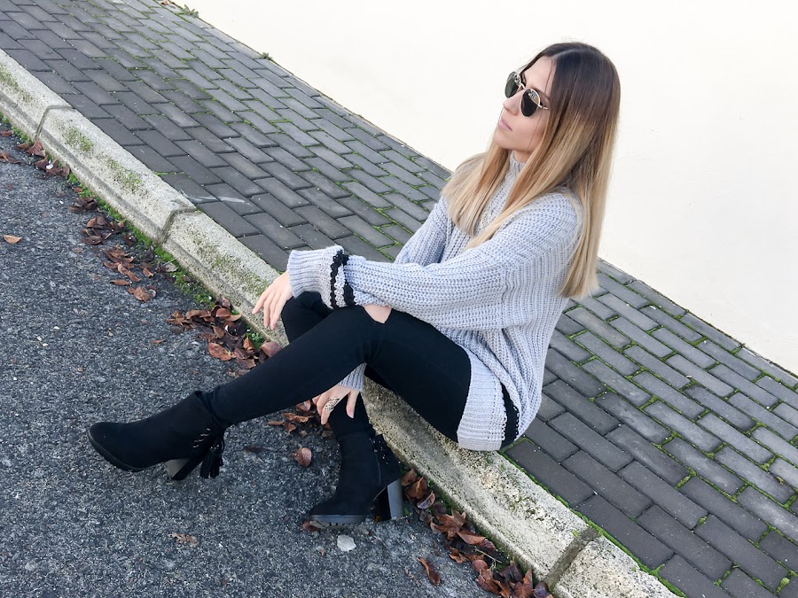 Lo he combinado con unos ripped jeans negros y unos botines negros con unas pequeñas hebillas en los laterales y cordones a los lados.