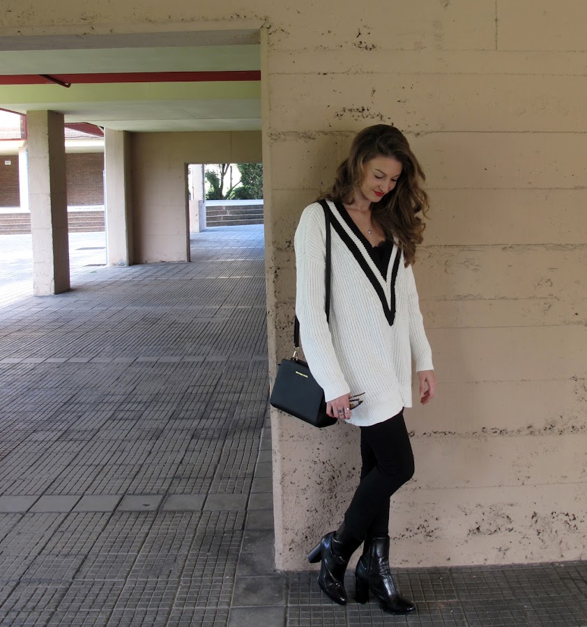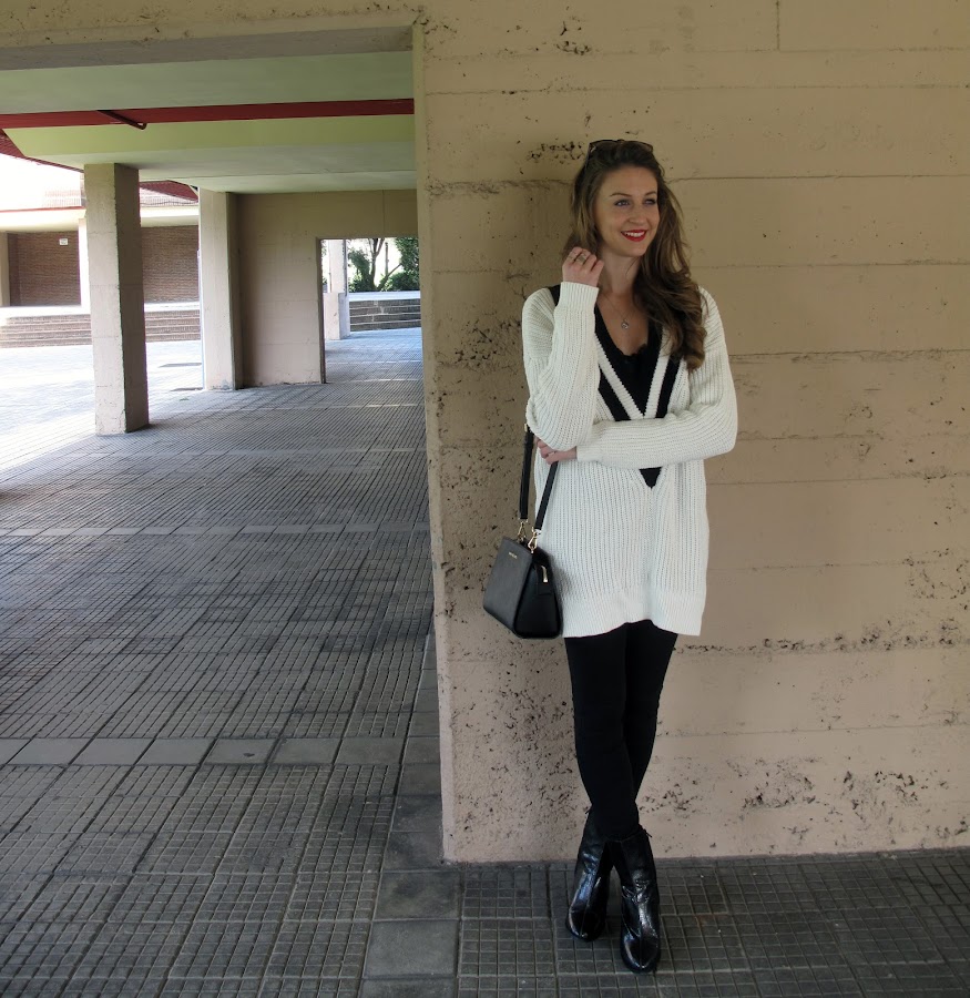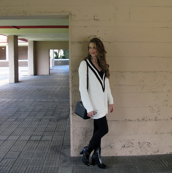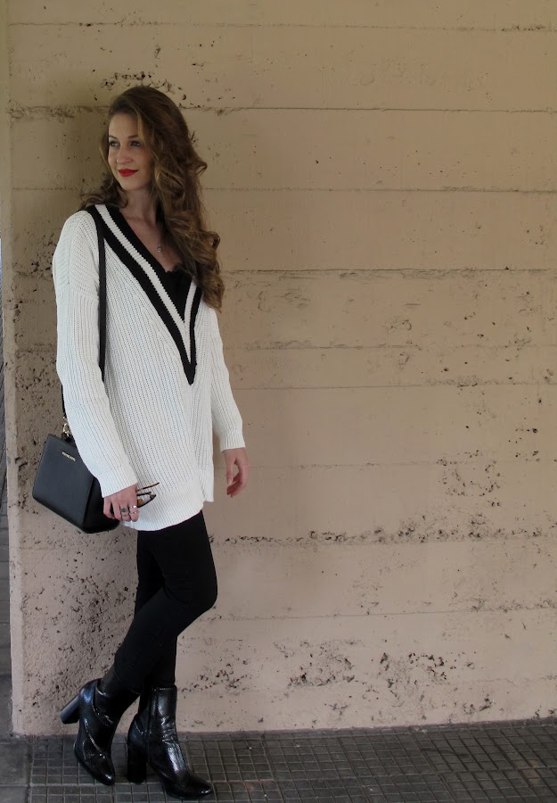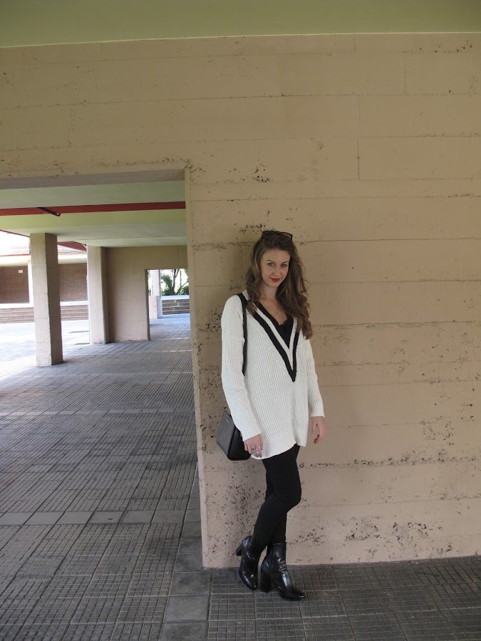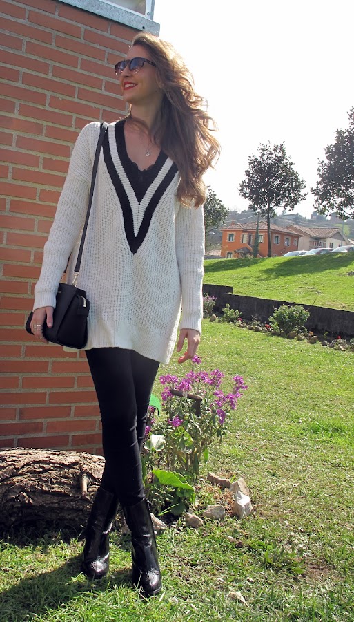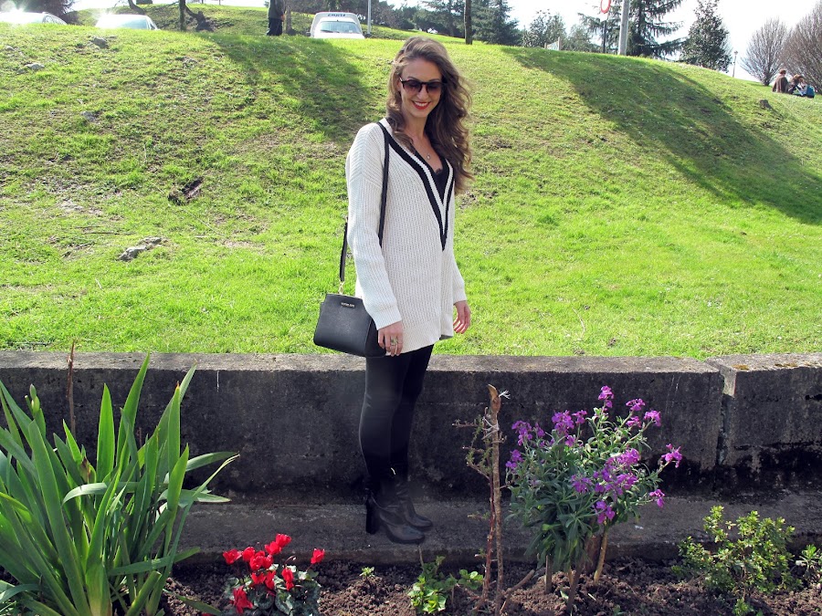 El jersey oversize se puede combinar de muchas formas, pero si es muy largo como este y lo combinas con pitillos o jeans ajustados te hace las piernas mas largas y delgadas.