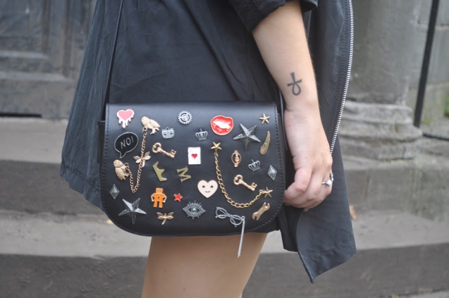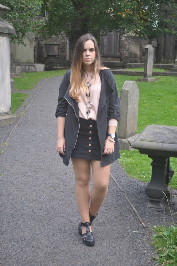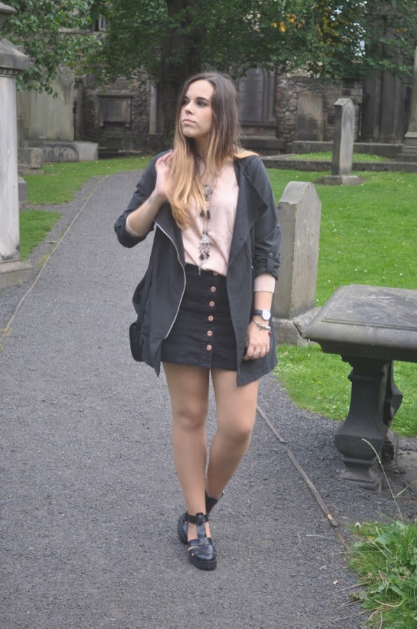 Como estaba el día estaba un poco fresco elegí una falda a botones (eso si, con medias), un jersey rosa de punto y una parka no muy gorda (tampoco era plan de morir de calor). Como complementos el único bolso que me llevé (y que veréis mucho porque me encanta), mis nuevas cangrejeras (que también veréis mucho hahaha) y maxi collar plateado.