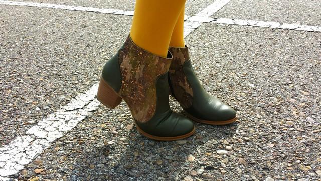 Los botines verdes, hechos en España por la firma MiMao, son de piel y me encantaron por su suave tacto y por lo comodísimos que son. Tacón de una altura perfecta y muy originales con esa mezcla de piel y detalles en diferentes tonos de marrón y dorado.