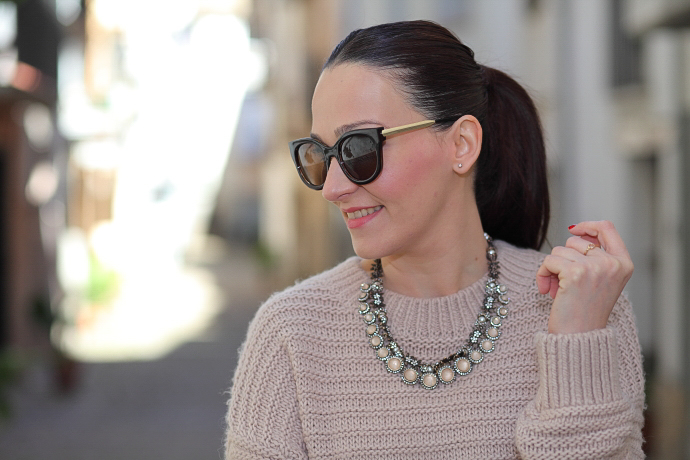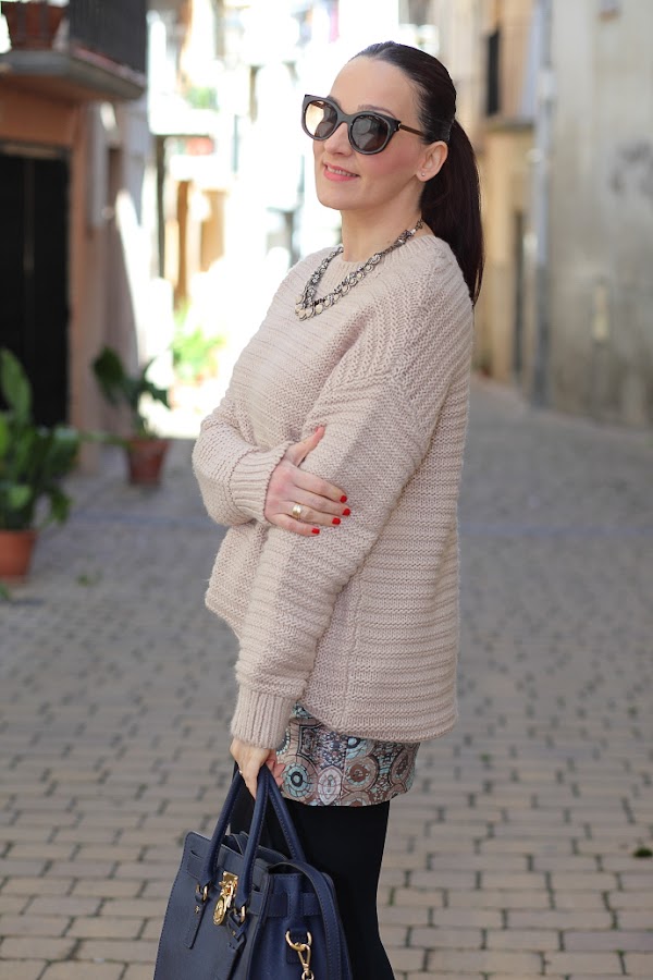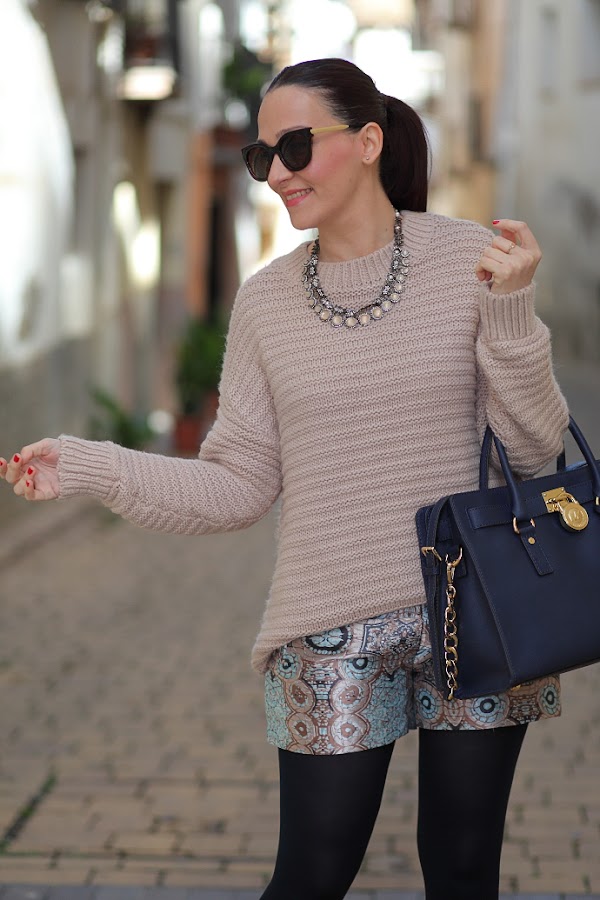 Con lo que me gusta llevar shorts hace unos días revisando cosas del blog me di cuenta de que este invierno casi no me los había puesto. Así que quería lucirlos otra vez, por eso os traigo este look y alguno más que tengo pendiente de enseñaros. Me puse estos pantalones cortos que los compré el verano pasado y combinados con media tupida azul marino quedan genial. En la parte de arriba, llevo mi jersey oversize preferido en tono nude. Le he añadido un collar joya y bolso azul marino de Michael Kors.