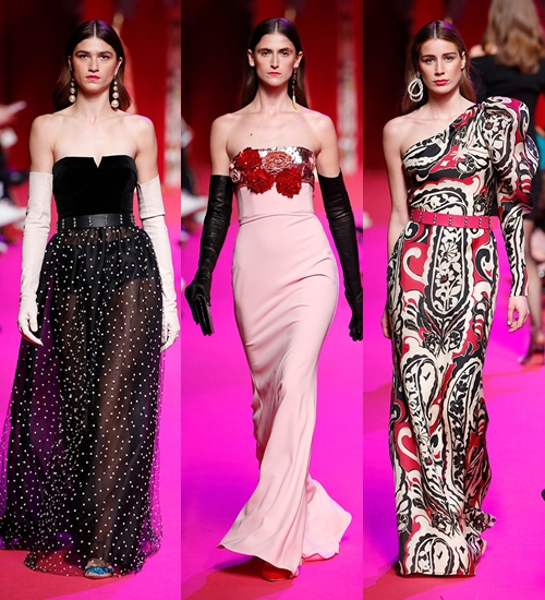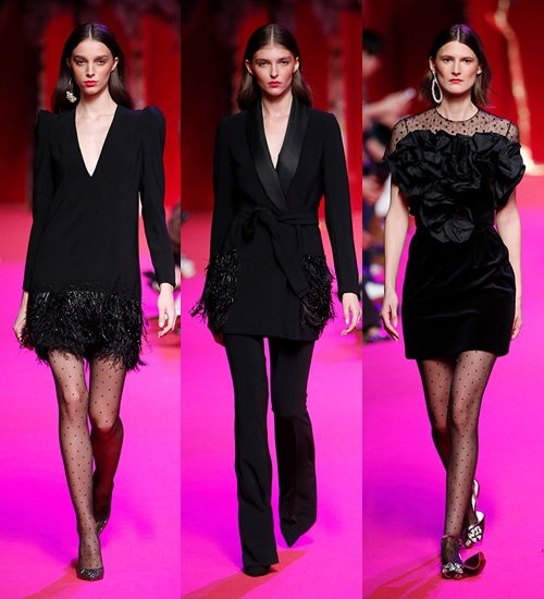 Muy presente también en esta colección el color negro. Blazer con hombros abullonados, blazer tipo smoking, prendas con flecos, medias plumetti y siempre buscando acentuar la silueta de la mujer.