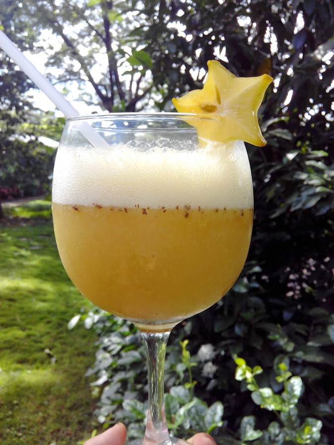 Todo en la batidora potente y sirve muy frío decorado con una rodaja de carambola que le da esa bonita forma de estrella.