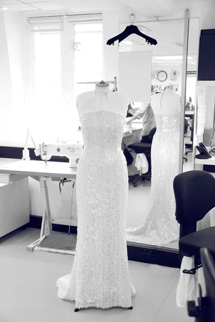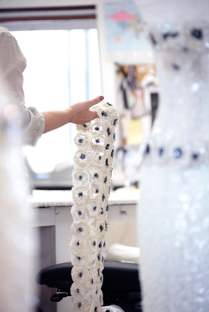Finalmente el resultado fue un espectacular vestido de organza blanca con crepé de satén, con 80.000 lentejuelas de resina pintadas a manos y 160 flores bordadas de lentejuelas de cristal, marfil, tul y organza en beige y negro.