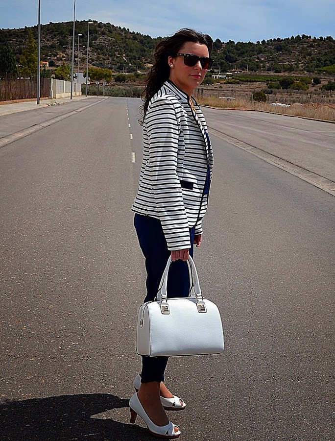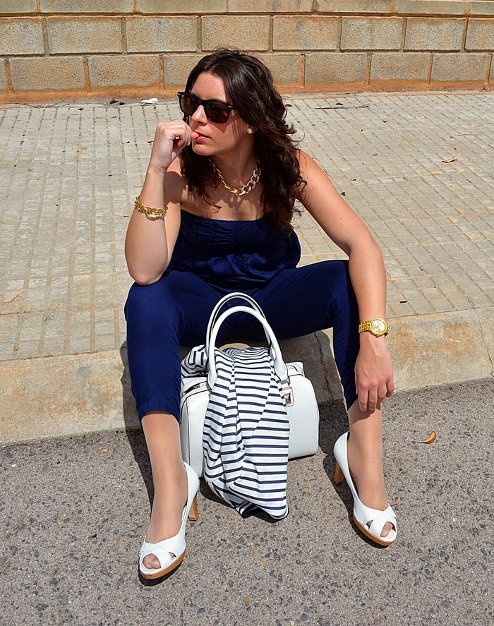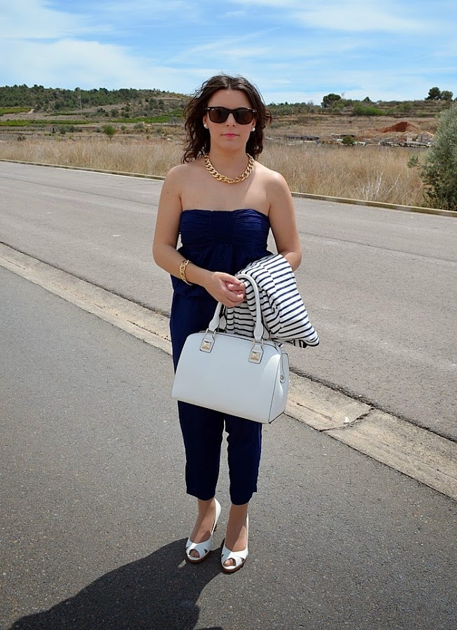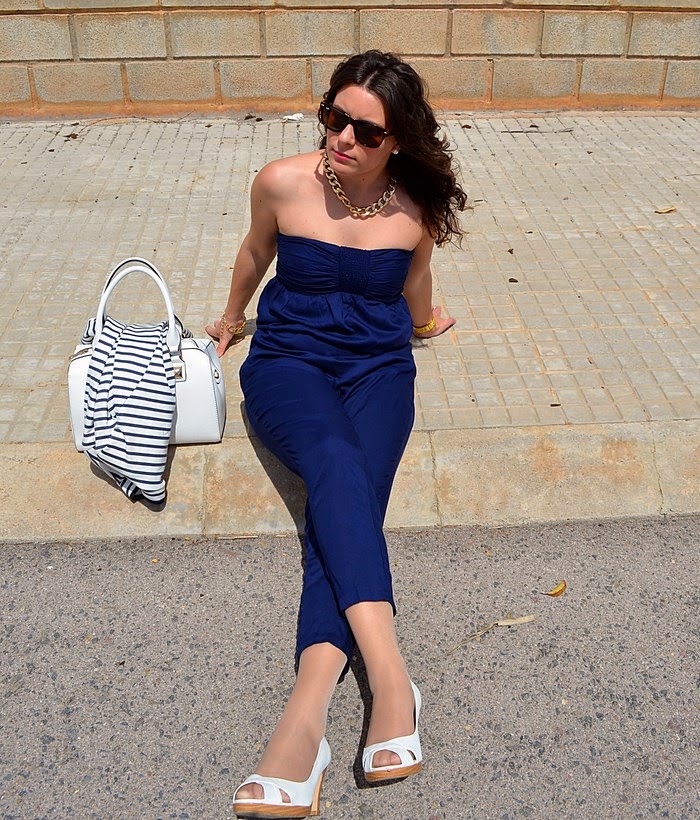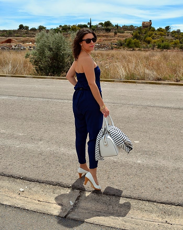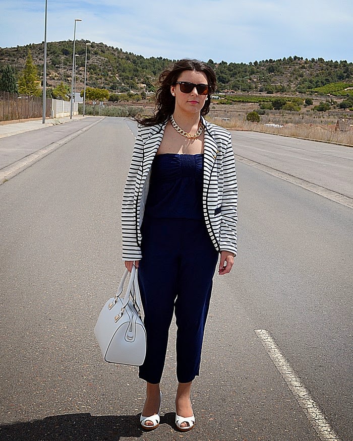 Hoy os propongo un look elegante para diario o para fin de semana. Viene marcado por dos super tendencias de la temporada, los monos y el estilo marinero. Este mono azul navy lo tengo de hace por lo menos un par de años, y lo he recuperado del fondo del armario. Es muy cómodo y fresquito por el tipo de tela y porque queda holgadito. Creo que este año le voy a sacar mucho provecho con el simple hecho de cambiarle los complementos y añadirle algún que otro cinturón o fajín. La blazer de rayas es de la primavera pasada de Mulaya. Este año se siguen llevando mucho las rayas y en su tienda tienen blazers muy similares a esta. (al final del post os pongo los enlaces)