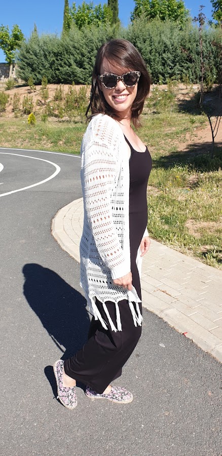 Me lo puse un día para salir a dar una vuelta con los peques y comer por ahí, así que en plan muy cómodo, con kimono encima al principio y luego ya sin nada encima, cuando apretaba el calor. En los pies súper cómoda con alpargatas cerradas negras con flores :)