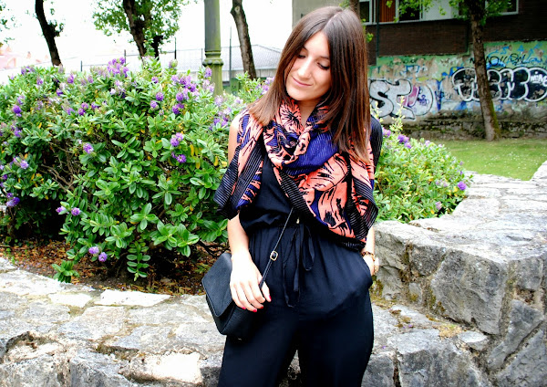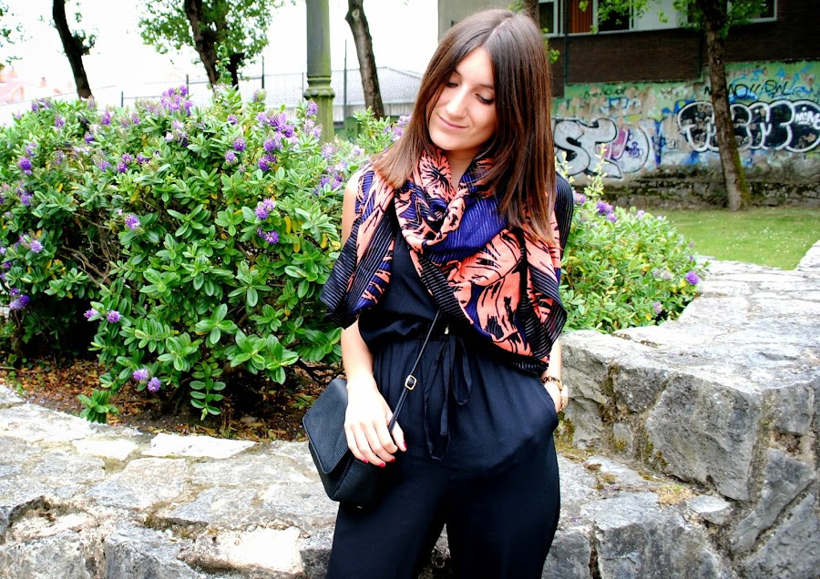 Pues sí, al igual que el anterior de Pao, el look de hoy vuelve a estar basado en un "jumpsuit". Son prendas tan tan cómodas que en tardes/noches de verano se convierten en nuestras grandes aliadas. En este caso, su color negro y su corte, hacen que sea perfecto para cualquier evento de noche, por eso decidí combinarlo con unas sandalias de tacón y un colorido pañuelo para aportar ese toque de chispa. ¡Espero que os guste!