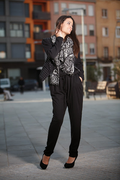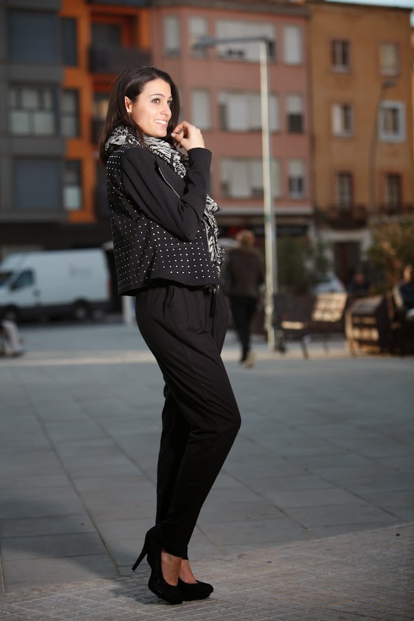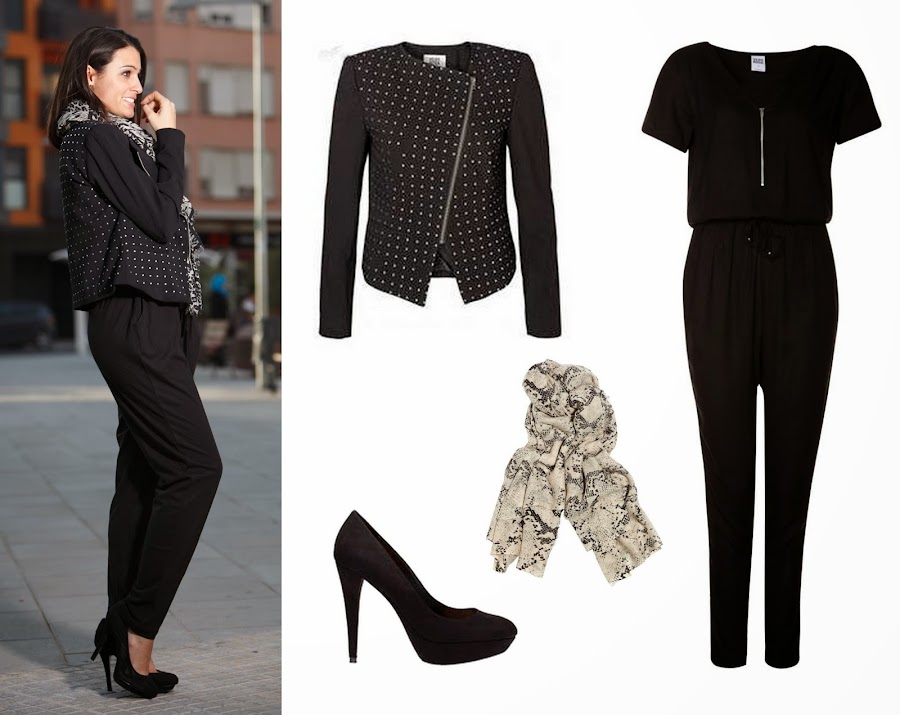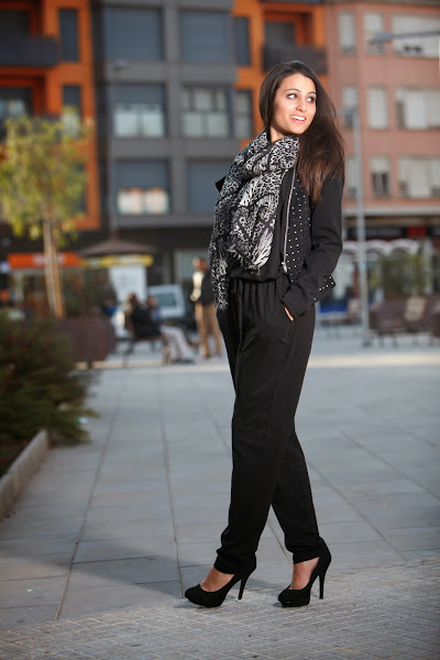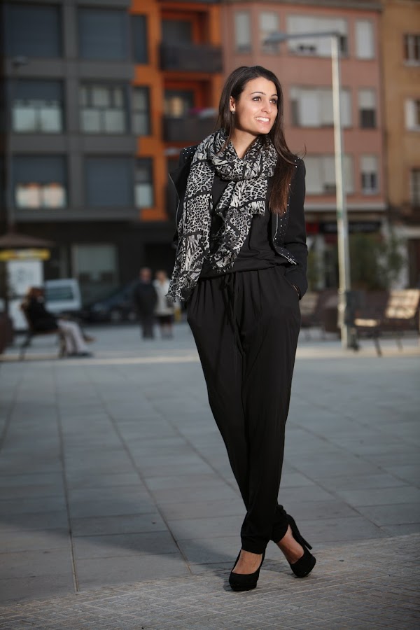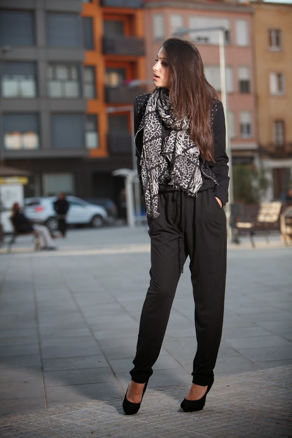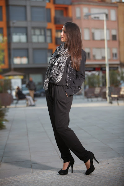 Bueno hoy os dejo con un look pensado para el finde. El negro forma parte de todos los armarios y nos da juego a infinidad de combinaciones. He sacado del armario mi JUMPSUIT en negro junto con una cazadora negra con detalles en plata y para darle el toque final un pañuelo leopard print en gris y negro. Aunque como podéis ver, en la imagen de arriba, he puesto uno de estampado piton. Creo que también es una buena opción ¿Qué creéis?¡Feliz fin de semana! ¡Pasadlo bien!