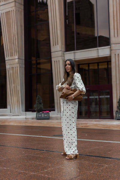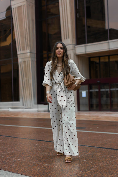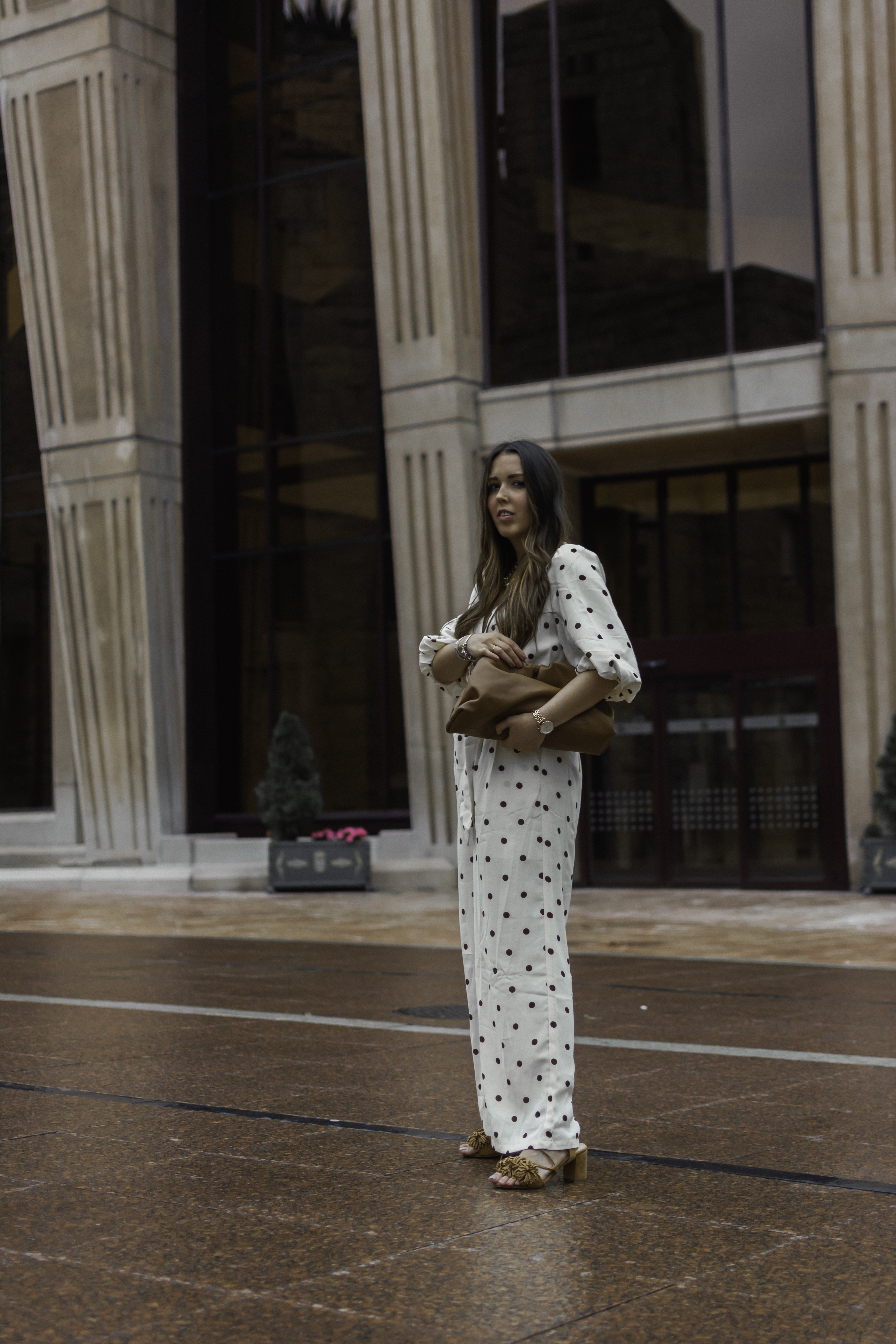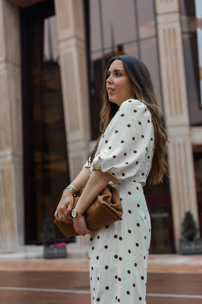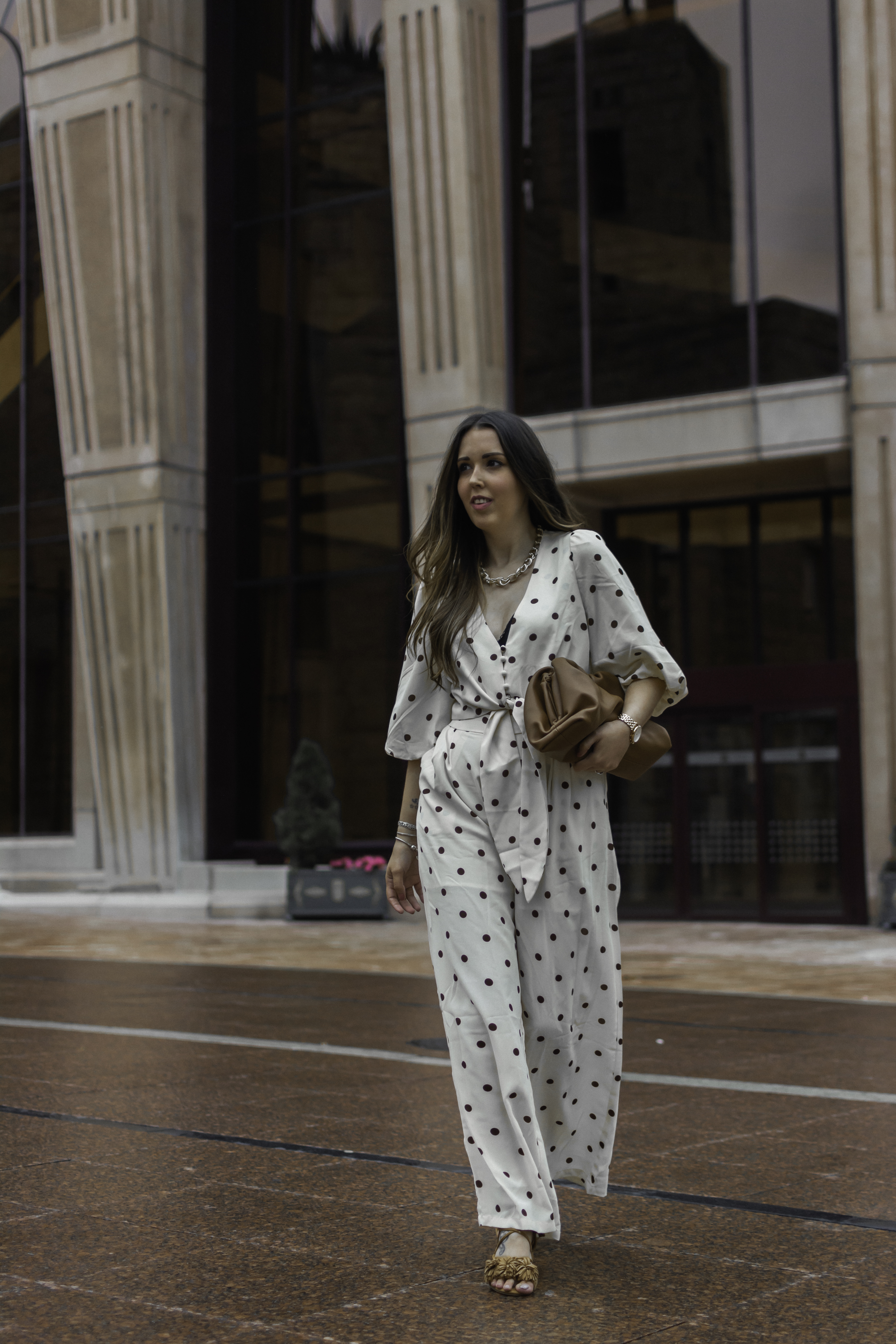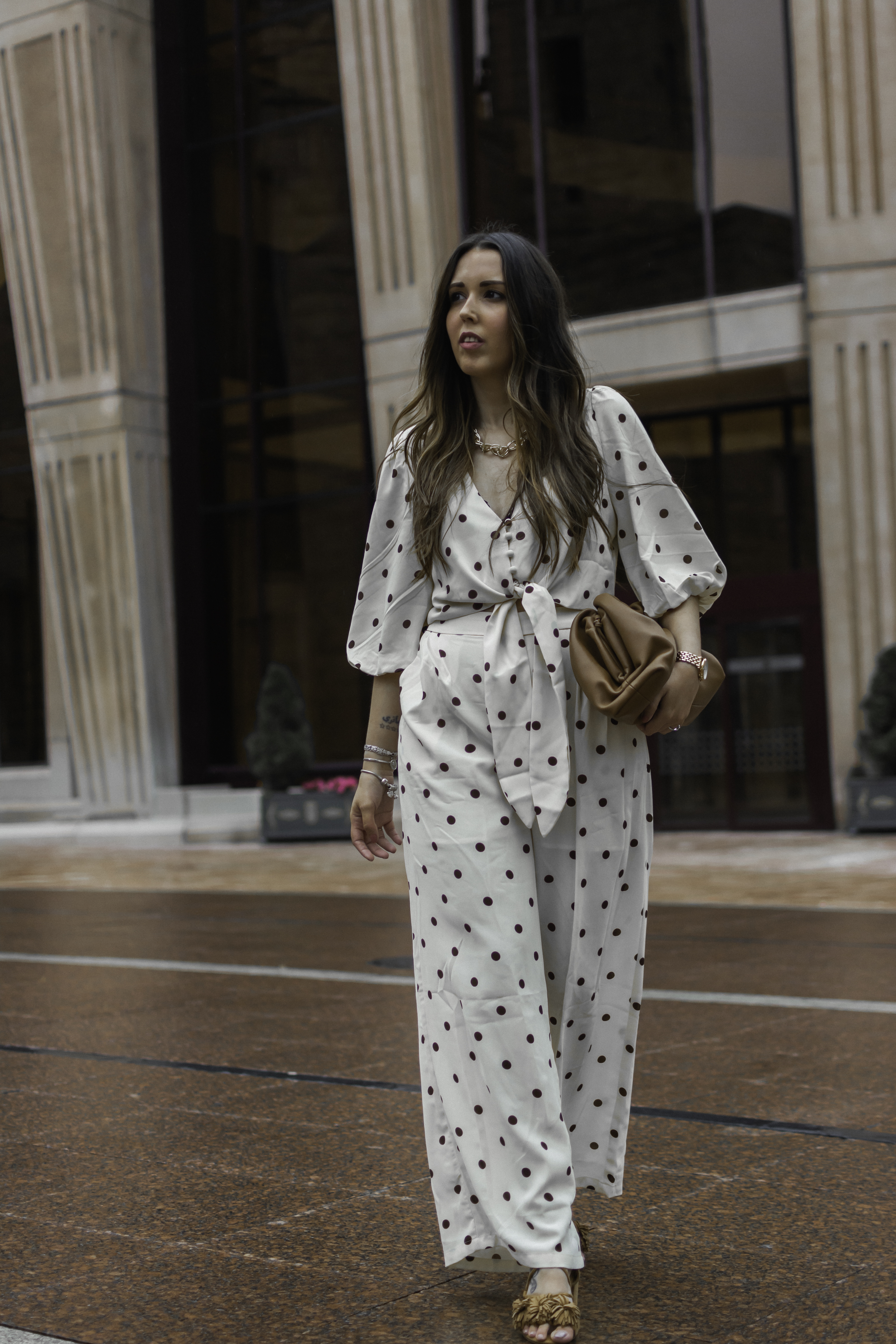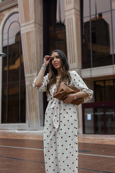 Al final la tendencia se resume a que la estética nos recuerde a un pijama, pero sin serlo. Si no te atreves, puedes empezar poco a poco y no crear un total look, puedes combinar una camisa de ese estilo con unos jeans y unas sandalias o mocasines, darás un toque sofisticado y actual al outfit sin falta de arriesgar. Pero si lo que te gusta es cumplir la tendencia, márcate un look como el que llevo hoy. Es un dos piezas en color blanco roto con lunares marrones (mi amor por los lunares es algo eterno). La camisa lleva un detalle de lazo en la parte de la cintura, lo que le da un aire diferente marcando la diferencia entre las dos partes. El pantalón palazzo, no puede parecerme más elegante con unas sandalias. Me parecieron geniales estas con pompones, atan al tobillo y son muy bonitas, a la par que cómodas ¡y el bolso! Objeto de deseo e inspiración total de Bottega Veneta. El conjunto es de Shein y tenéis un 15% de descuento con mi código brunette15.