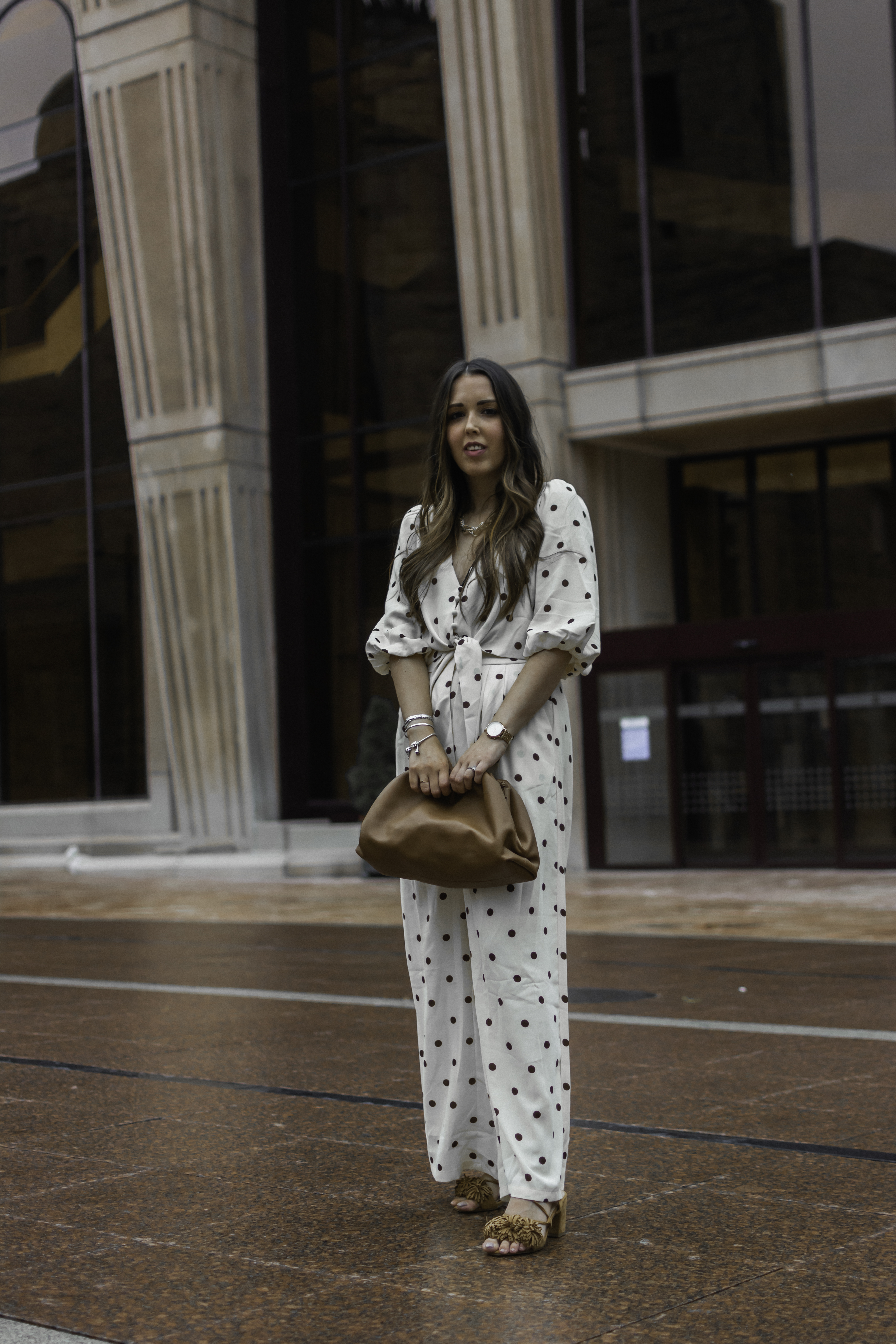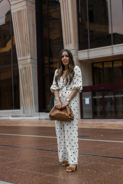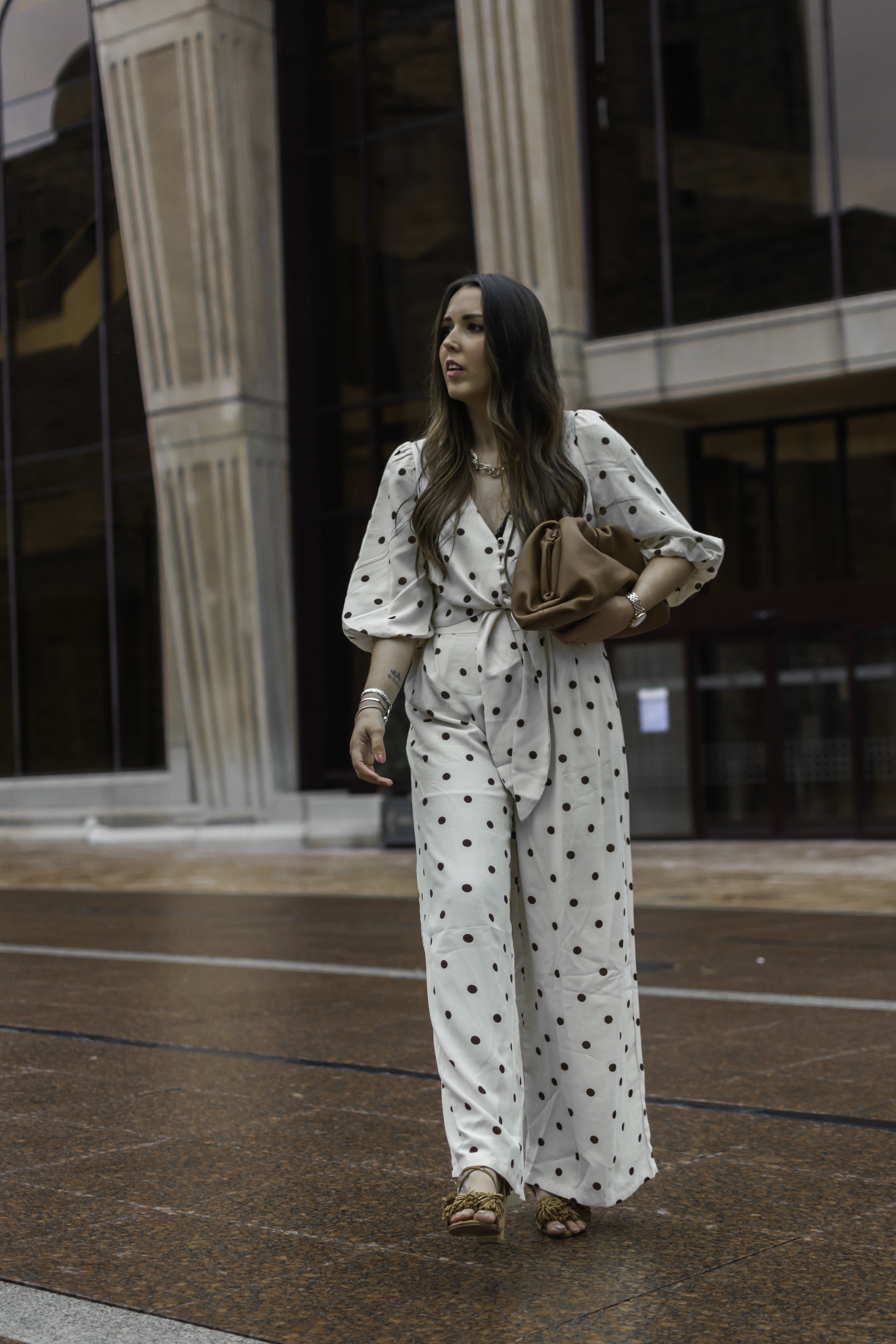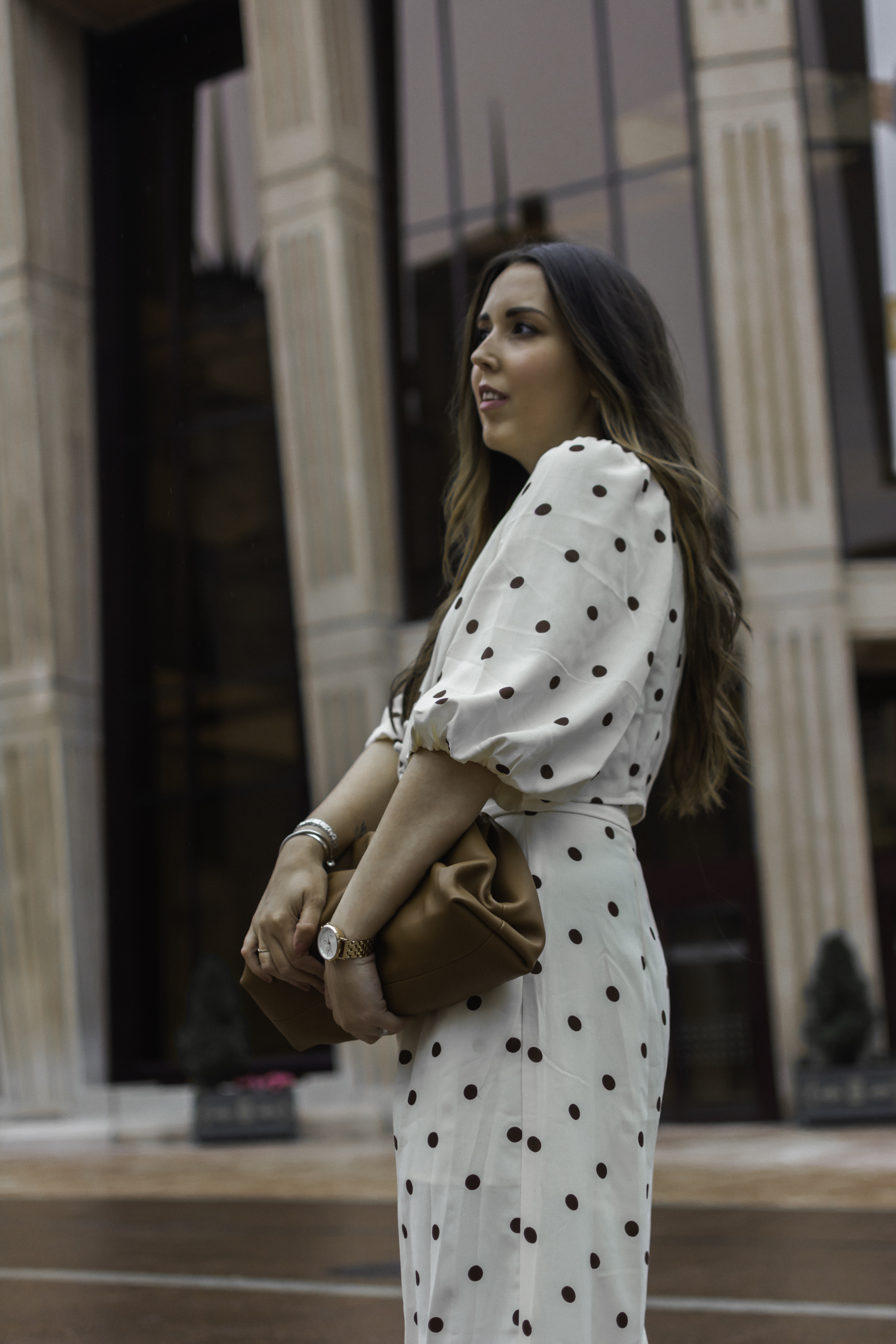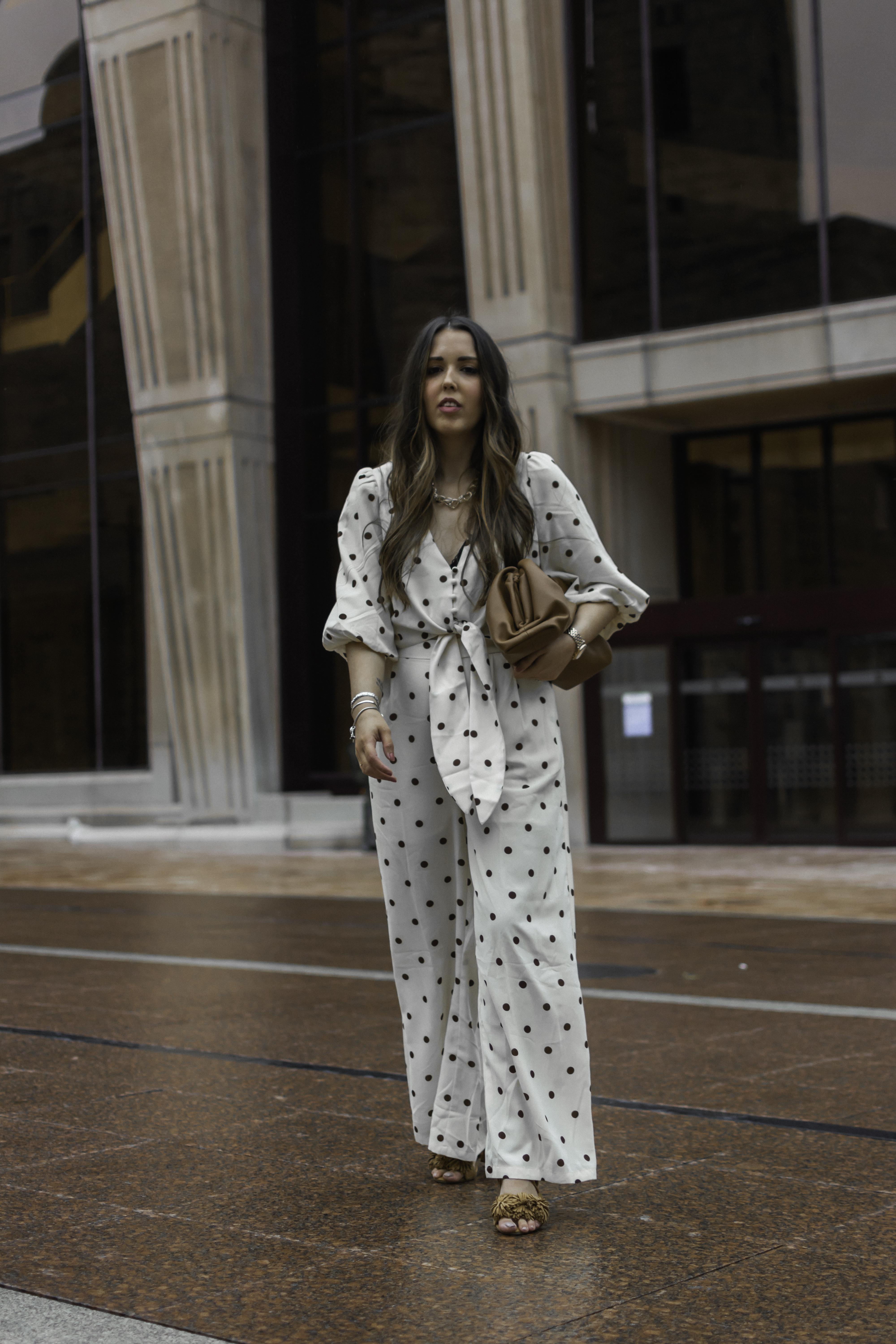 Al final la tendencia se resume a que la estética nos recuerde a un pijama, pero sin serlo. Si no te atreves, puedes empezar poco a poco y no crear un total look, puedes combinar una camisa de ese estilo con unos jeans y unas sandalias o mocasines, darás un toque sofisticado y actual al outfit sin falta de arriesgar. Pero si lo que te gusta es cumplir la tendencia, márcate un look como el que llevo hoy. Es un dos piezas en color blanco roto con lunares marrones (mi amor por los lunares es algo eterno). La camisa lleva un detalle de lazo en la parte de la cintura, lo que le da un aire diferente marcando la diferencia entre las dos partes. El pantalón palazzo, no puede parecerme más elegante con unas sandalias. Me parecieron geniales estas con pompones, atan al tobillo y son muy bonitas, a la par que cómodas ¡y el bolso! Objeto de deseo e inspiración total de Bottega Veneta. El conjunto es de Shein y tenéis un 15% de descuento con mi código brunette15.
