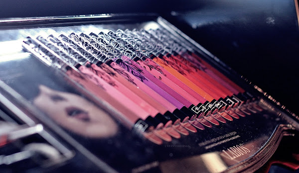 KAT VON D BEAUTY SWATCHES: left: EVERLASTING LIQUID LIPSTICK: Witches, Exorcism, Bachelorette, Melancholia. Right: STUDDED KISS LIPSTICK: Poe, Slayer, Lovecraft, Wolvesmouth