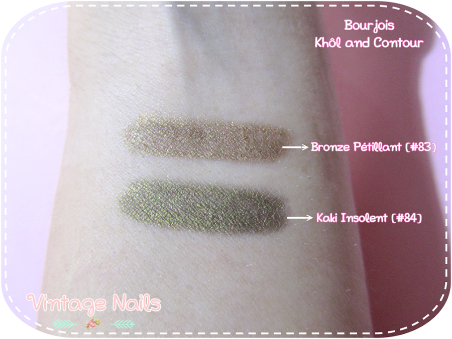 Los tonos que Bourjois me mandó para que probara son el Bronze Pétillant (nº 83) y el Kaki Insolent (nº 84). El Bronze Pétillant es un color oro viejo metalizado y el Kaki Insolent es un tono verde oliva metalizado. Ambos muy bonitos. Yo jamás me los hubiera comprado, para el contorno de ojos soy bastante clásica y sólo uso marrón o negro, así que al principio pensé que no iba a sacarles mucho partido a estos lápices, pero una vez aplicados me ha gustado bastante el resultado.