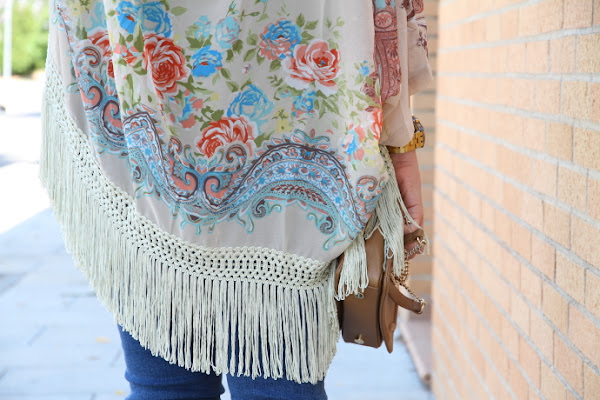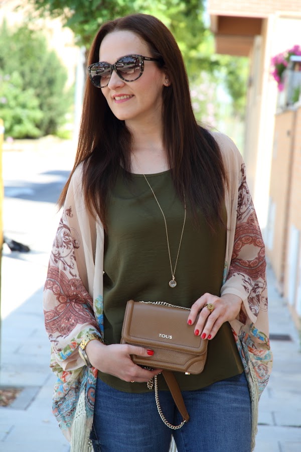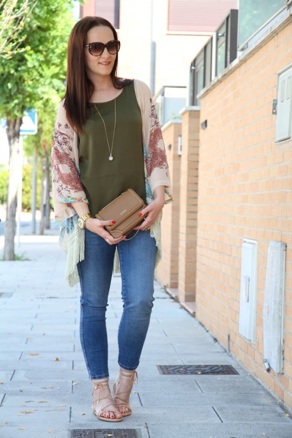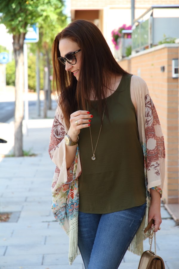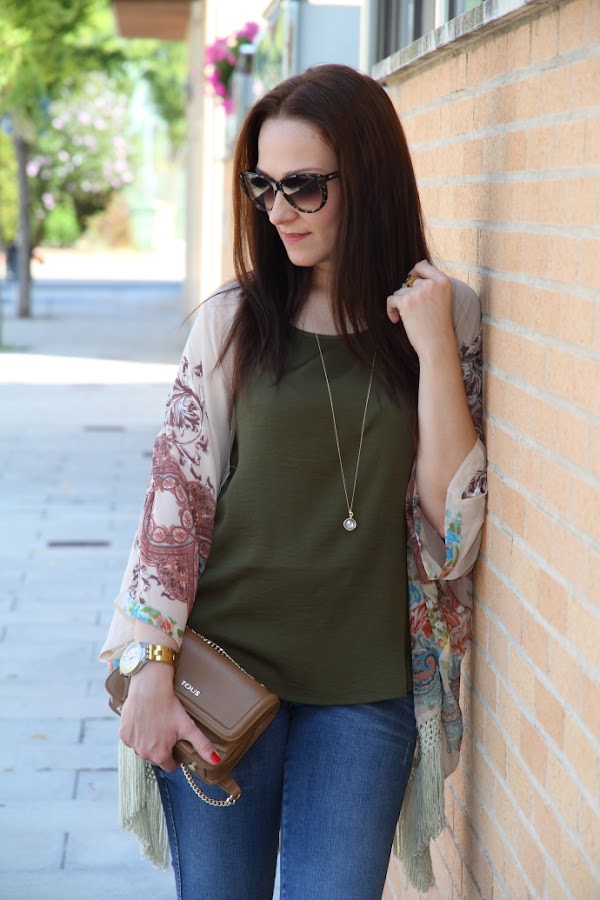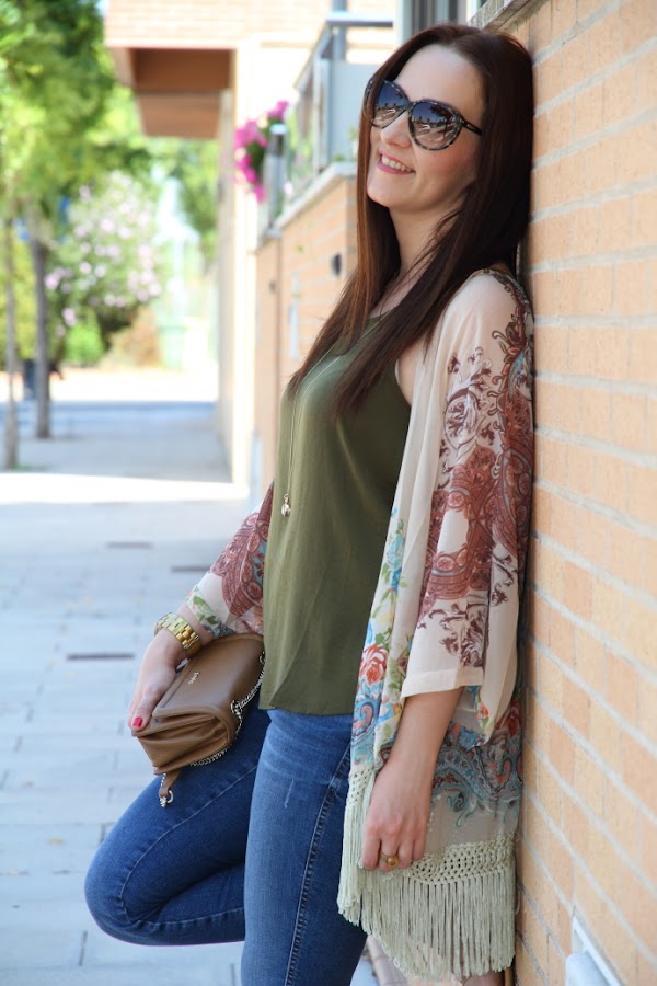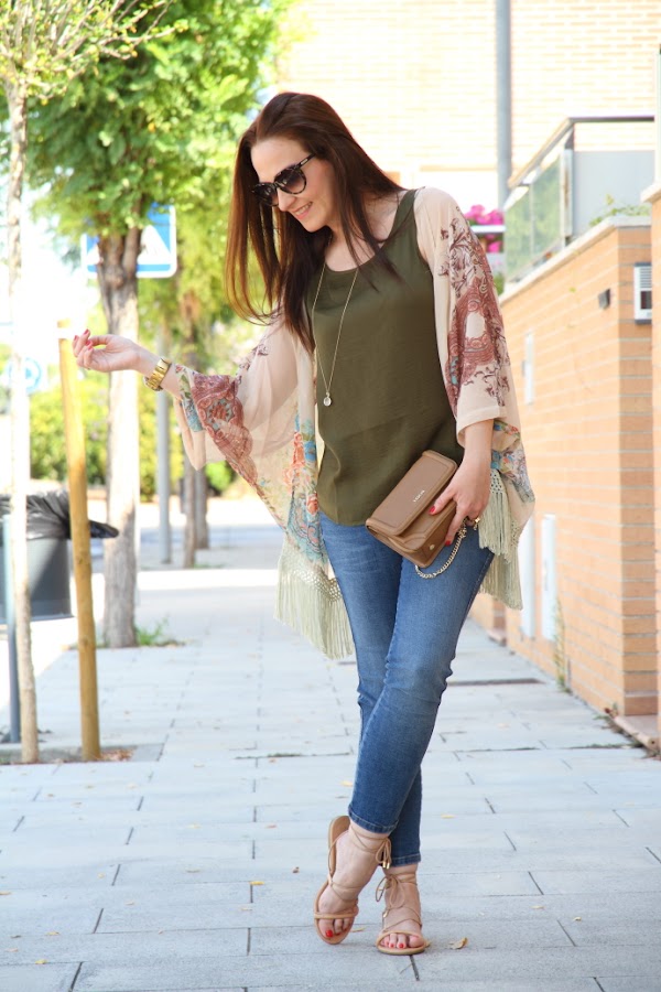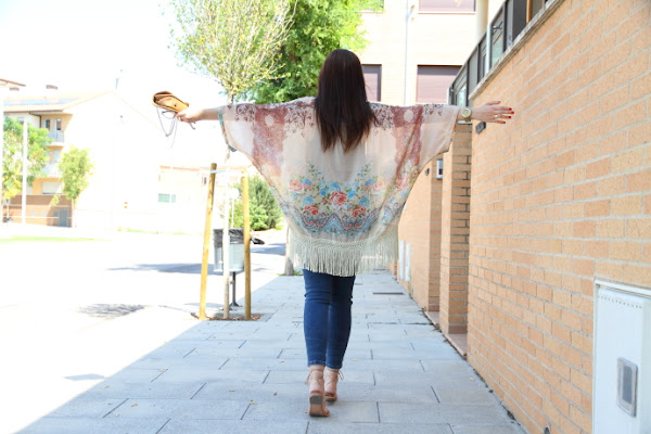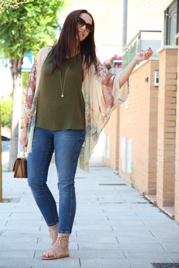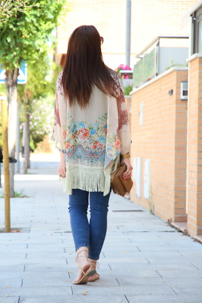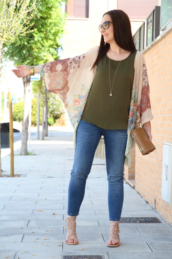 Alguna vez ya os he comentado que los kimonos son una prenda que me gusta por lo que en mi armario tengo varios. Sin embargo este verano me he dado cuenta que sin tener un porqué tan apenas los estoy utilizando. Por eso cuando la semana pasada llegó a casa este kimono de flores de Dressgal decidí estrenarlo para salir a comer con mi marido. Muy fácil de combinar esta vez lo llevé con jeans pitillo, top básico y sandalias romanas en color nude.