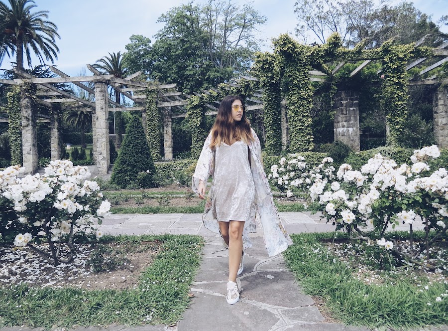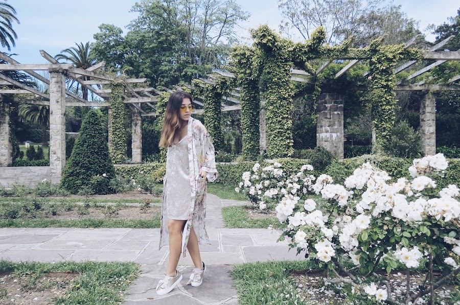 Llevo un vestido lencero de terciopelo en tono champán, que combina genial con mis nuevas deportivas de LUCIA DE LA ROSA, son en tono metalizado dorado, son el modelo "DEPORTIVAS PIEL BRILLO", y lo mejor de todo es que son super cómodas, ideales para el verano, yo las customice con estas cintas de terciopelo haciendo estos maxilazos que las hace únicas.