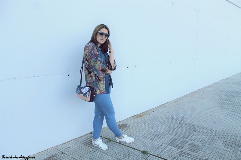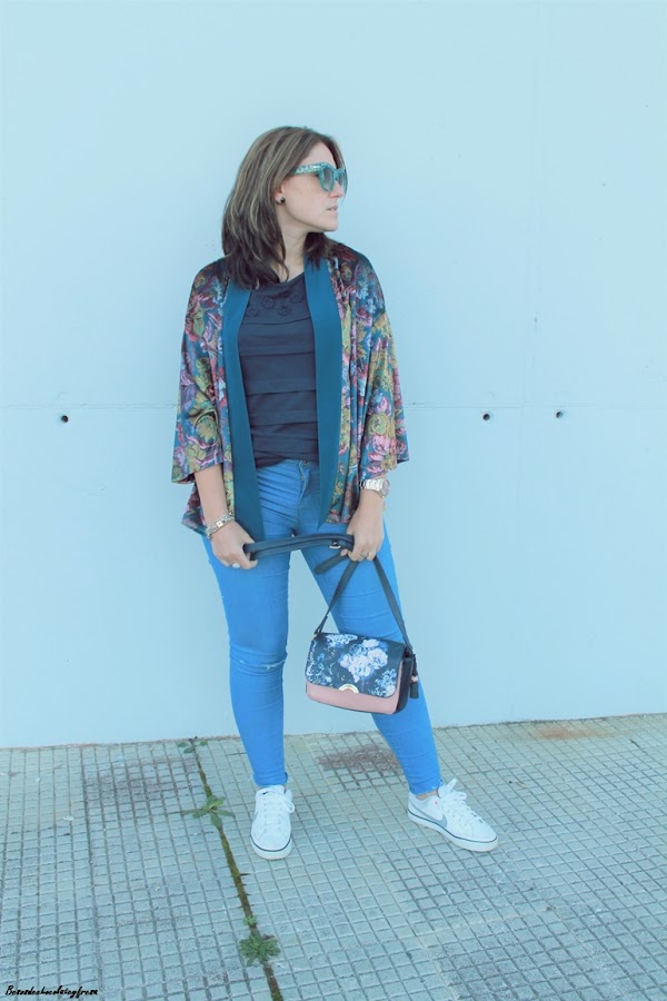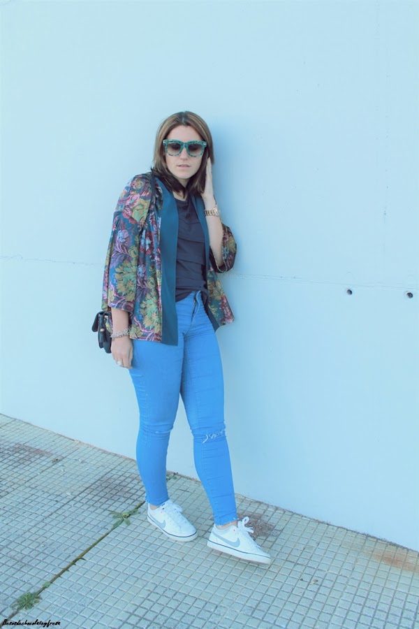 Completo el look con jeans claros con rotos en las rodillas, camiseta básica en azul marino, y bolso en el mismo color con el print floral también como estampado junto con mis inseparables sneakers de nike que tanto estoy usando ultimamente.
