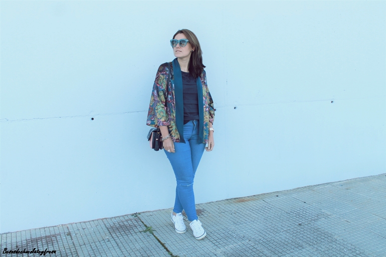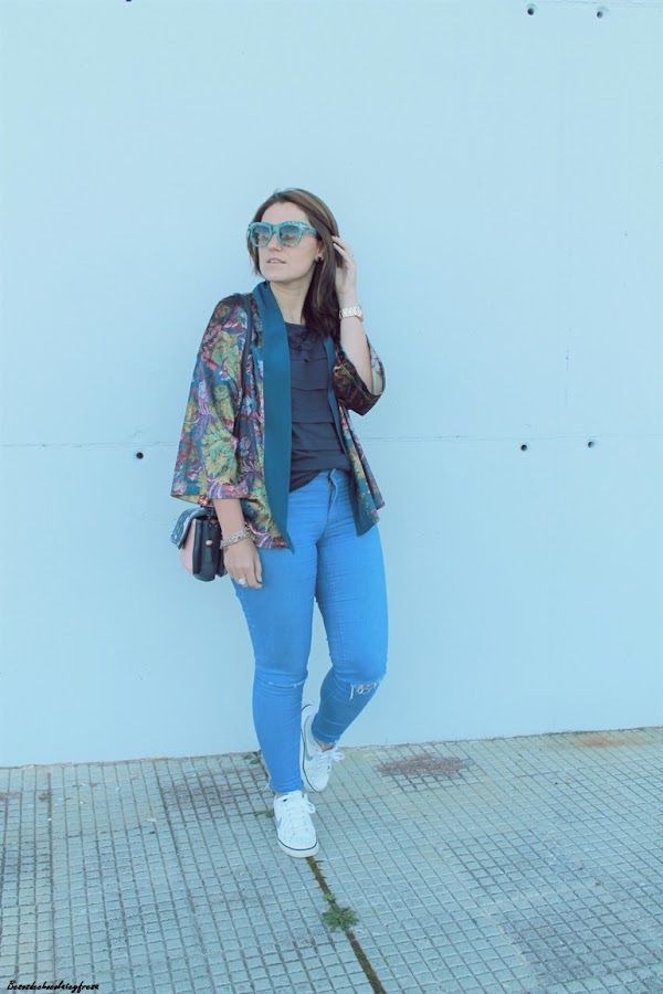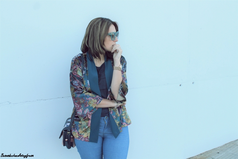 Esta tendencia cada vez me gusta más, hace que los estilismos tengan un toque chic y elegante a pesar de que en el look de hoy lo lleve con jeans y prendas básicas. Opté por combinarlo con colores del estampado del mismo, azules, verdes y rosas dándole un toque divertido con mis nuevas gafas de print en color mint de Zaful.