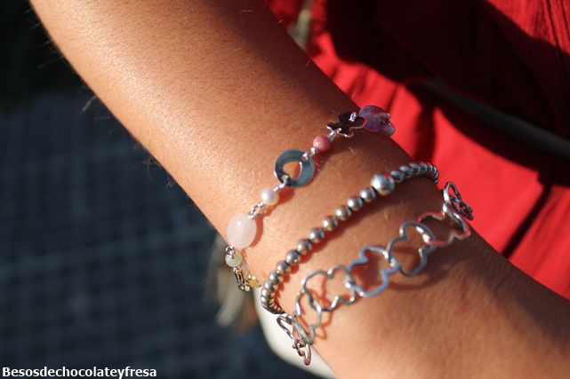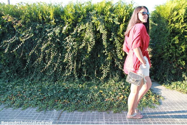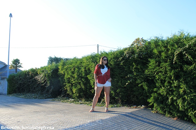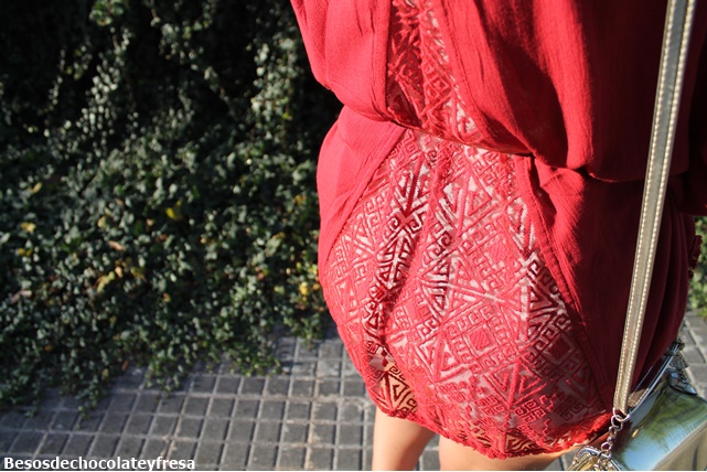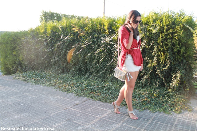 Today I show a look with another monkey, because I find them very comfortable for summer and these days of September are still full of sun. It is a white jumpsuit with skort skirt accompanied by a red kimono with lace sleeves and back, gold belt, jewel necklace and purse to match.