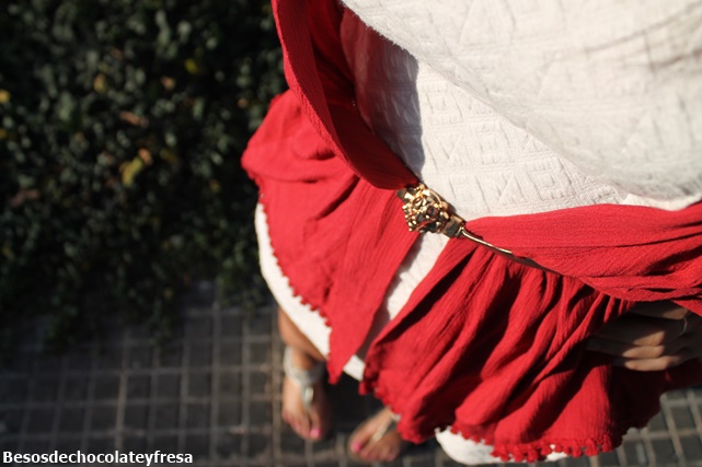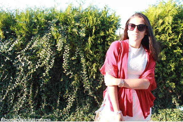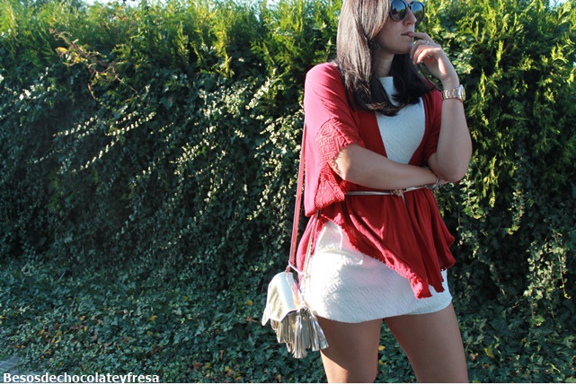 Hoy os muestro un look con otro mono, pues me parecen muy cómodo para el verano y estos días de septiembre que aún vienen cargados de sol. Se trata de un mono blanco con la falda skort acompañado de un kimono en rojo con encaje en la mangas y la parte trasera, cinturón dorado, collar joya y bolso del mismo tono.