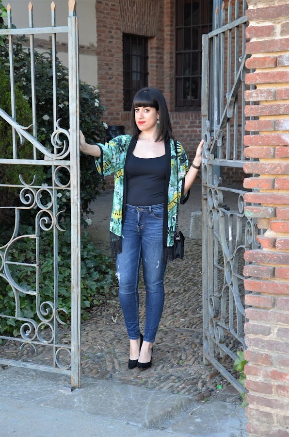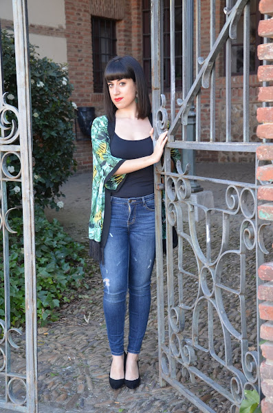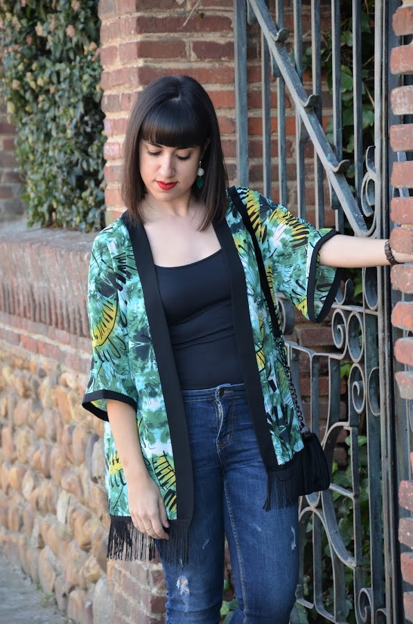 Voy a empezar por este kimono de estampado tropical, con manga francesa, ribete negro y flecos en la parte baja. Fue amor a primera vista. Los colores, el corte, la tela fluida... una combinación de 10.