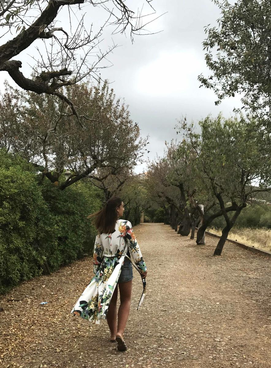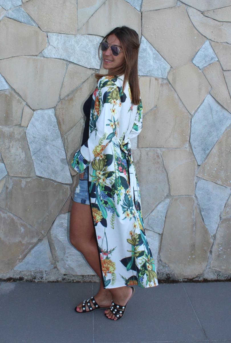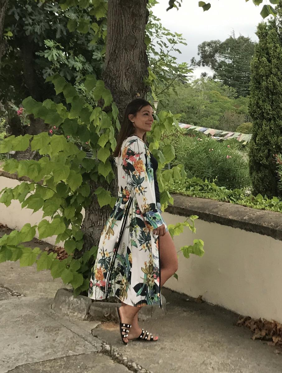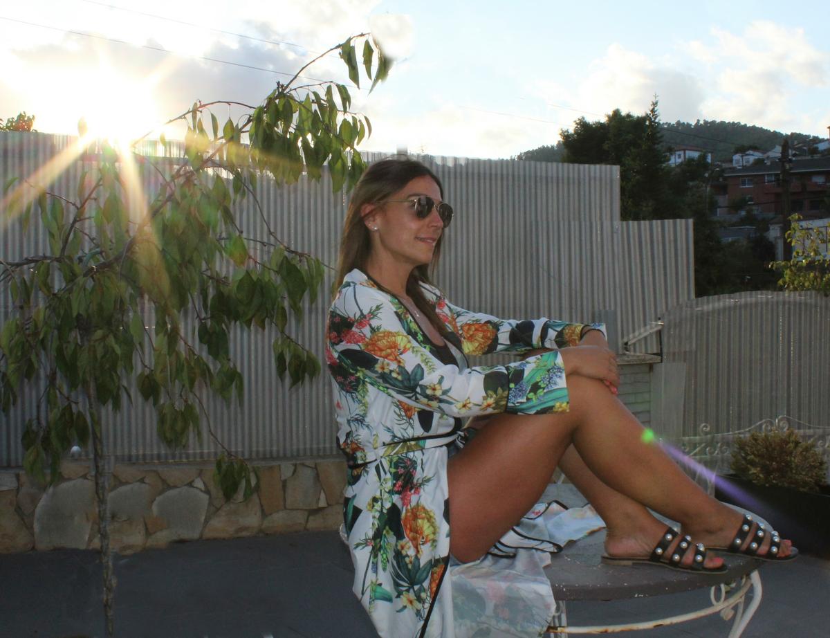 Reuniendo estas dos tendencias os dejo el look de hoy, en el que buscaba comodidad y debido al lugar dónde me encontraba protegerme un poco del fresquito de las primeras horas de la mañana, con lo que opté por un conjunto básico de short tejano y camiseta básica combinada con un bonito kimono floral de la marca ROMWE, con cinturón que nos da la posibilidad de llevarlo cerrado, abierto, atado atrás…. y a los pies unas palas compuestas por tres tiras adornadas con multitud de perlas, un zapato descanasado y adecuado para caminar.