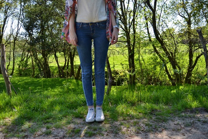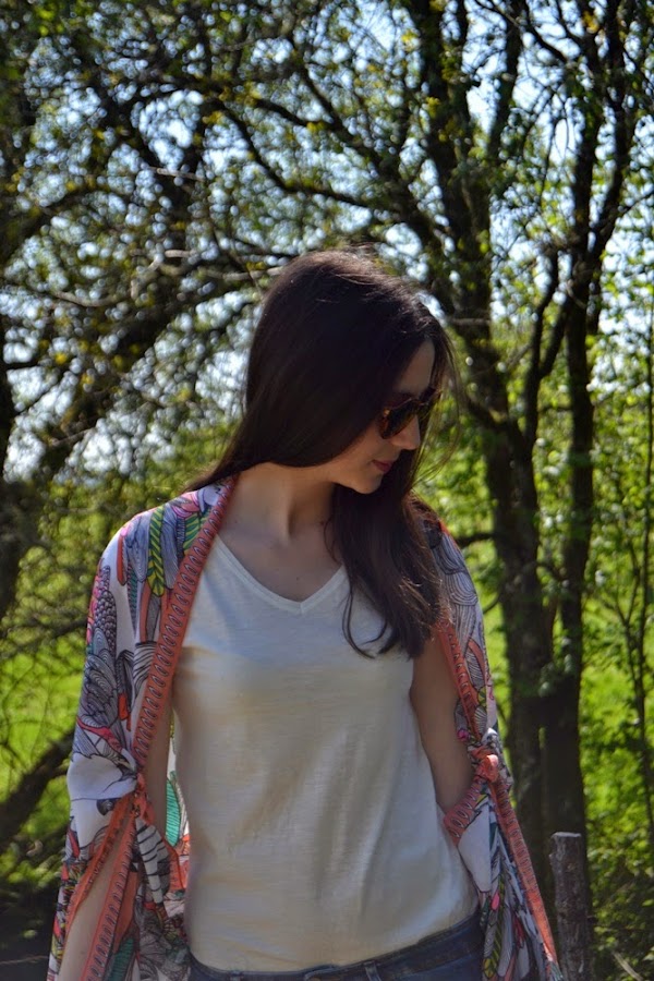 El look de hoy es algo sencillo, perfecto para estos días de calor casi veraniego que hemos tenido, compuesto por un "kimono" hecho con un fular, unos vaqueros y mis inseparables converse blancos.