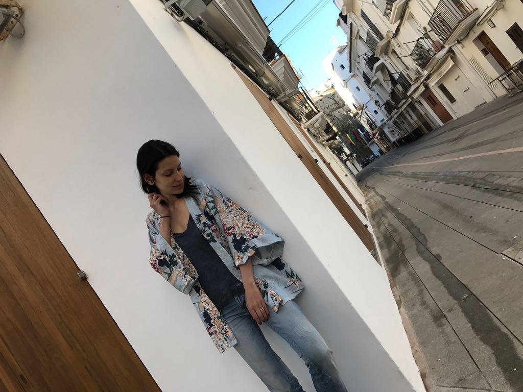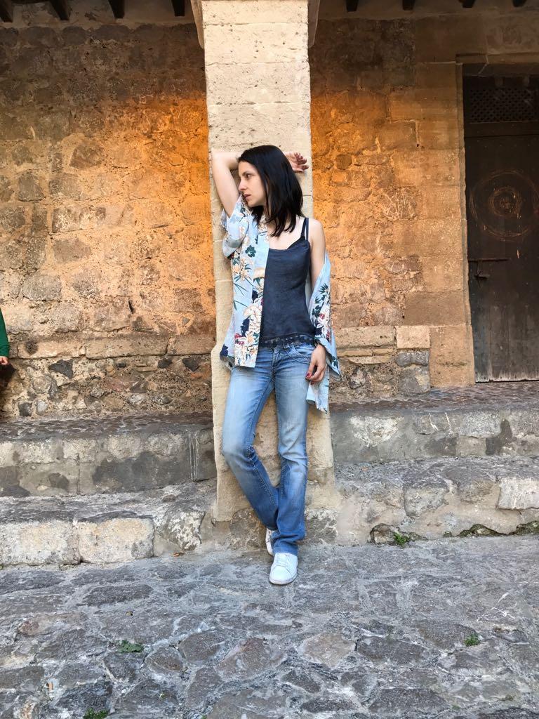Es un kimono ligero, vaporoso, que combinado con un top lencero y unos tejanos no necesita más. Es una prenda perfecta para la primavera, que da un toque de elegancia y originalidad a cualquier outfit. Aunque unos tacones rematarían de maravilla el look, en un viaje prima la comodidad y con ella mis bambas preferidas.
