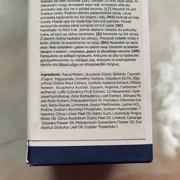 Agua, butilenglicol, dimetilsulfona, betaína, triglicérido caprílico / cáprico, goma natto, hialuronato de sodio, EDTA disódico, extracto de centella asiática, extracto de raíz de Glycyrrhiza Glabra (regaliz), policuaternio-51, clorfenesina, tocoferil acetato, carboxomerina , Extracto de fruta / hoja / tallo de Luffa Cylindrica, Beta-Glucano, Extracto de flor de Althaea Rosea, Extracto de hoja de Aloe Barbadensis, Hidroxietilcelulosa, Extracto de Portulaca Oleracea, Lisina HCL, Prolina, Fosfato de ascorbilo de sodio, Acetil metionina, Teanina, Aceite de lavanda angustifolia , Aceite de hoja de eucalipto globulus, aceite de flor de Pelargonium graveolens, aceite de cáscara de limón cítrico (limón), aceite de cáscara de cítrico Aurantium Dulcis (naranja), aceite de flor de Cananga Odorata, tripéptido de cobre 1, linalol, limoneno.