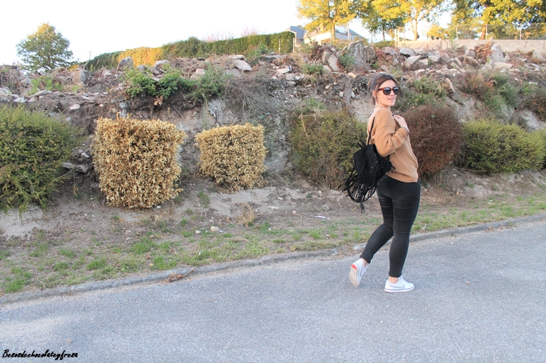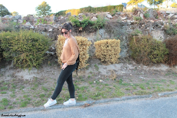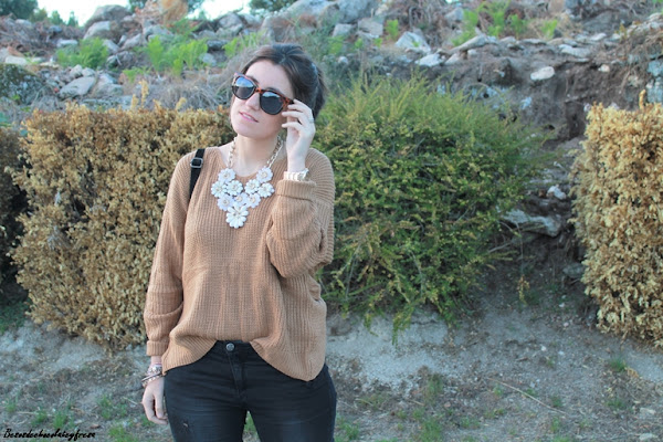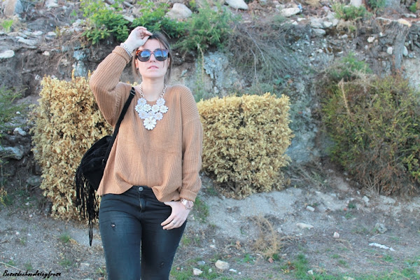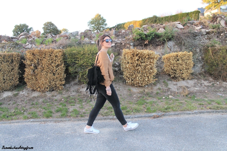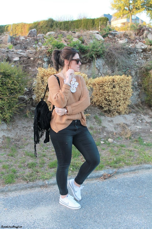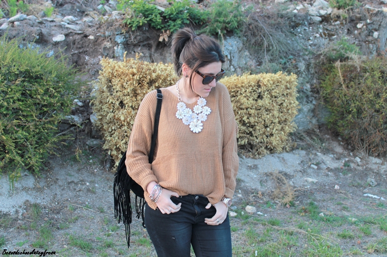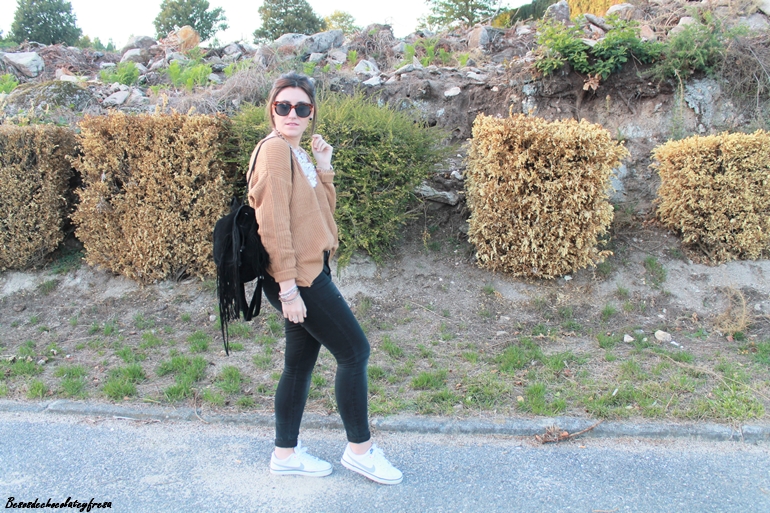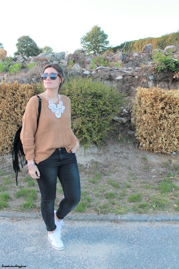 De punto godito, manga larga y cuello en pico de color marrón, lo combiné con jeans negros para hacer contraste y que resaltase todo su color sobre el, sneakers blancas, maxi collar joya en tono nude y mochila de flecos en negro.
