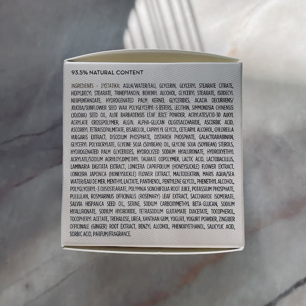 Aqua/water/eau, glycerin glyceryl sterate citrate, hexyldecyl sterate, triheptanoin, behenyl alcohol, glyceryl sterate, isodecyl neopentanoate, hydrogenated palm kernel glycerides, acaia decurrens/jojoba/sunflower seed wax polyglyceryl-3 esters, lecithin, simmondsia chinensis (jojoba) seed oil, aloe barbadensis leaf juice powder, acrylates/c10-30 alkyl acrylate crosspolymer, algin, alpha-glucan oligosaccharide, ascorbic acid, ascorbyl tetraisopalmite, bisabolol, caprylyl glycol, cetearyl alcohol, chlorella vulgaris extract, disodium phosphate, galactoarabinan, glyceryl polyacrytate, glycine soja (soybean) oil, glycine soja (soybean) sterols, hydragenated palm glycerides, hydrolyzed sodium hyaluronate, hydroxyethyl acrylate/sodium acryoyldimethyl taurate copolymer, lactic acid, lactobacilius, laminaria digitata extract, lonicera caprifolium (honeysuckle) flower extract, lonicera japonica (honeysuckle) flower extract, maltodextrin, maris aqua/sea water/eau de mer, menthyl lactate, panthenol, pentylene glycol, phenethyl alcohol, polyglyceryl-3 disostearate, poymnia sonchifolia root juice, potassium phosphate, pullulan, rosmarinus officinalis (rosemary) leaf extract, saccharide isomerate, salvia hispanica seed oil, serine, sodium carboxymethyl beta-glucan, sodium hyaluronate, sodium hydroxide, tetrasodium glutamate diacetate, tocopherol, tocopheryl acetate, thehalose, urea, xanthan gum, yogurt, yogurt powder, zingiber officinale (ginger), root extract, benzyl alcohol, phenoxyethanol, salicylic acid, sorbic acid, perfum/fragance.