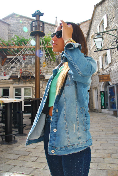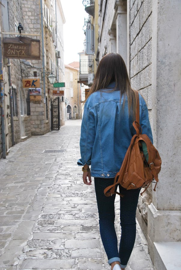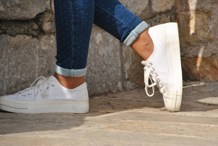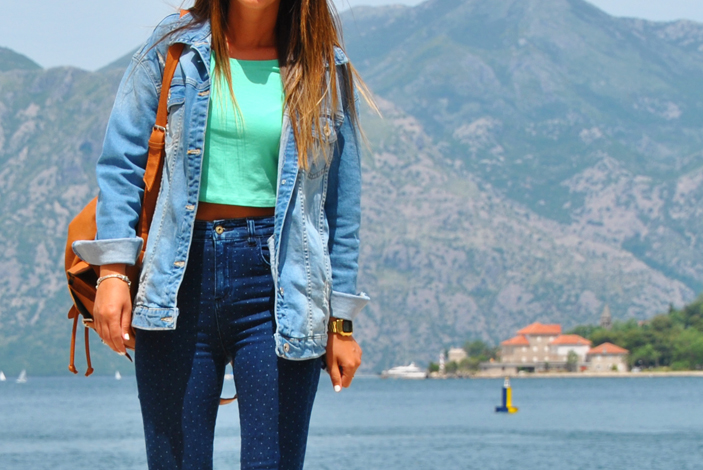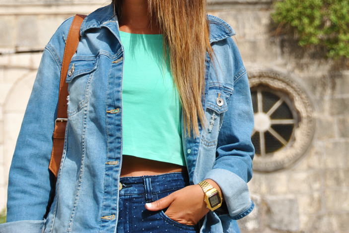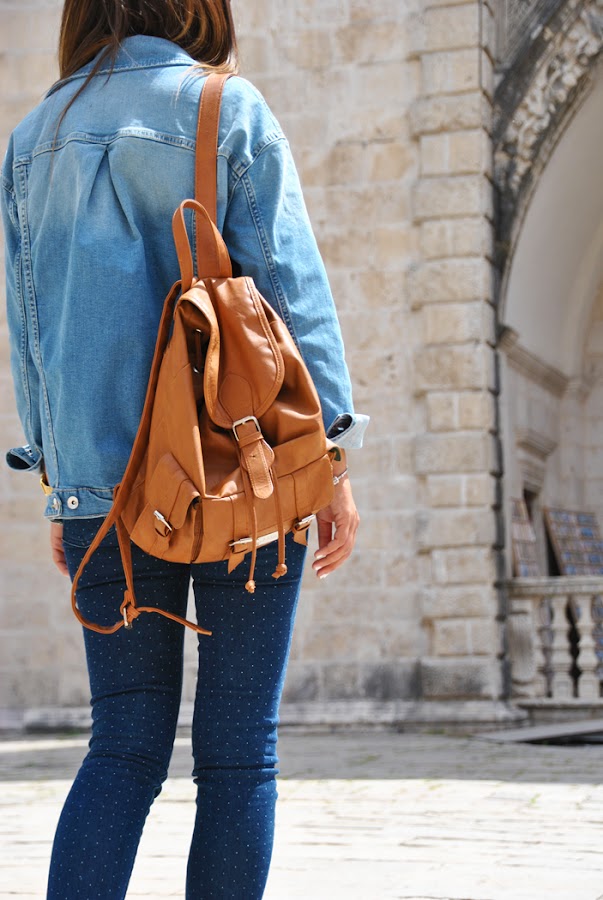 Respecto al outfit, os comento: polka dot jeans (me encantan) de tiro alto combinados con crop top y tejana oversize; complementados con sneakers blancas y mochila camel.