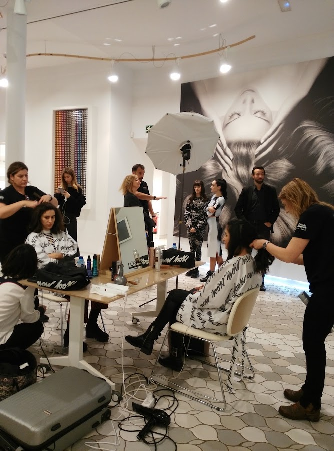La Academia de L´Oréal me dejo realmente impresionada ya que es un espacio enorme, con una decoración muy minimalista en la que predomina el blanco, algo que le da un carácter muy elegante y moderno. En la entrada, avisaron a Juana, la chica que me había invitado y me hicieron pasar a una sala enorme donde se podían ver varias mesas con grandes espejos y todas las herramientas necesarias para crear todo tipo de looks, junto con un montón de profesionales que a mi llegada ya estaban peinando a varias invitadas. Me pareció estar en una película, era la primera vez que acudía a una cita así y no me lo podía creer. Es ese tipo de situaciones que ves por televisión pero que nunca crees que puedes llegar a vivir en primera persona.
