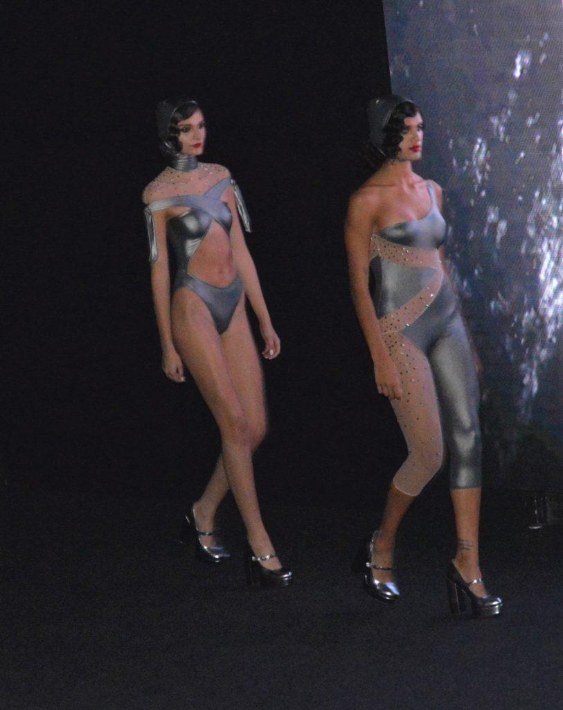 Enfundadas en unos estructurados trajes de baño confeccionados en tul invisible con laminas de plata y adornado con cristales de Swarovski, nuestra aspirante actriz consigue su primer papel.