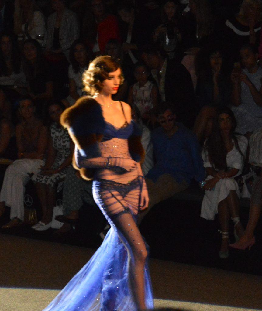 Nuria Sardá, hace un homenaje a la actriz de los años 40, Esther Williams, que era famosa por sus películas musicales con espectáculos acuáticos. Me fascina ver este tipo de diseños, ya que tienen que ir muy bien cortados y confeccionados para que se adapten lo mejor posible al cuerpo, por no hablar de que todas las piezas de Swarovski van puestas una a una a mano.