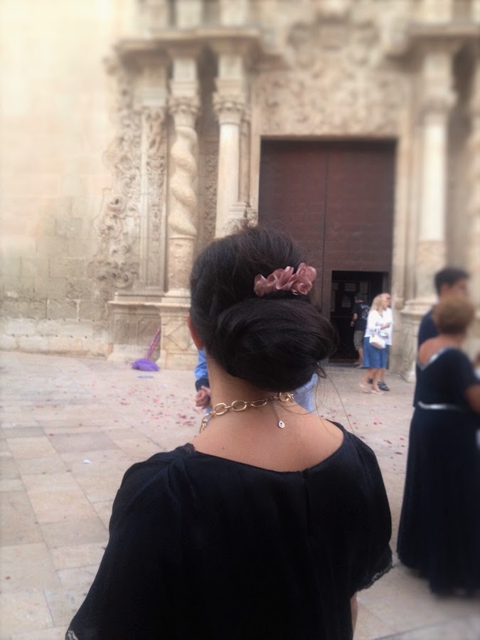 Mi peinado era obra mía, (creo que se nota), yo quería algo sencillo que pudiera realizar sola y que fuera un recogido, pero como me he cortado el pelo recientemente no me daba el pelo para hacerlo y opte por ponerme una coleta postiza, y hacer con ella el recogido y poner el fantástico mini tocado de secretos de Alcoba.