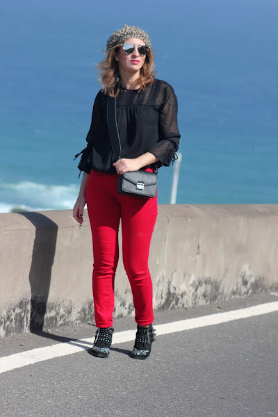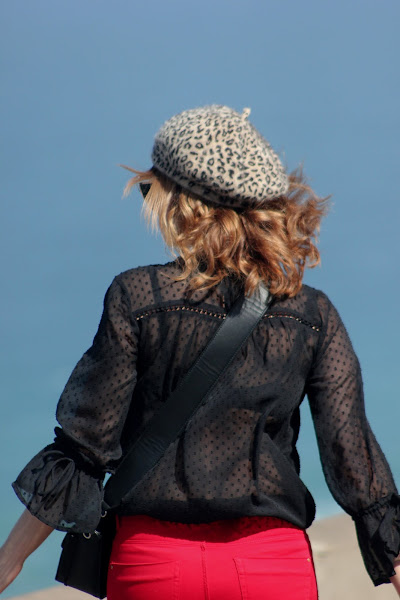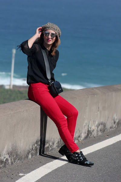 El outfit de hoy combina varias de las tendencias que llevaremos este otoño, una boina con estampado leopardo que también es trending esta temporada, sí, nuevamente, el animal print ha resurgido, aunque nunca desaparece del todo, este año vuelve a ser protagonista. Blusa con transparencias y plumeti que seguro has visto en varios colores en tu tienda favorita, la mía es de Sfera. Un bolso de asa ancha de estilo cross-body de Stradivarius. Jeans de Zara en color rojo, muy presente en este momento, también. Los botines de Primark con apliques metalizados que siguen siendo un must indispensable y un complemento esencial en Canarias, las gafas de sol, estas preciosas son de la firma Runa Canarias, estilo cat-eye, modelo Timanfaya, que me fascinan.