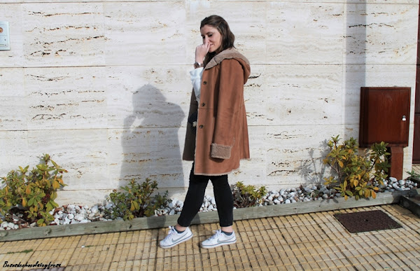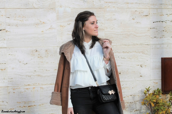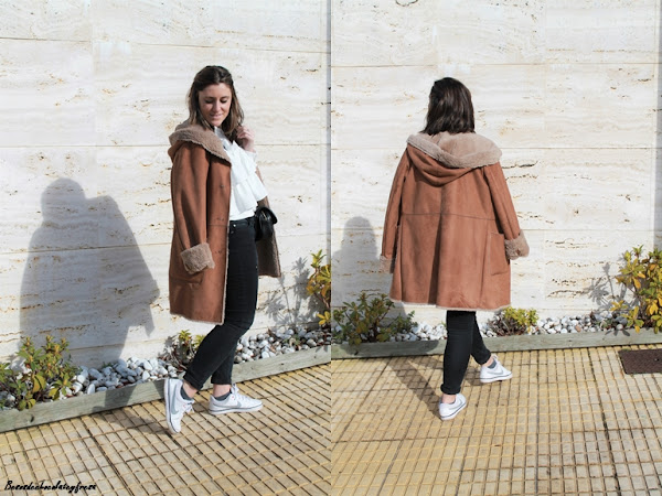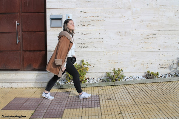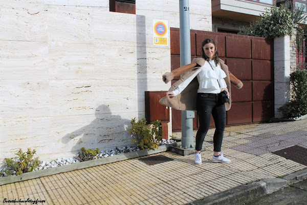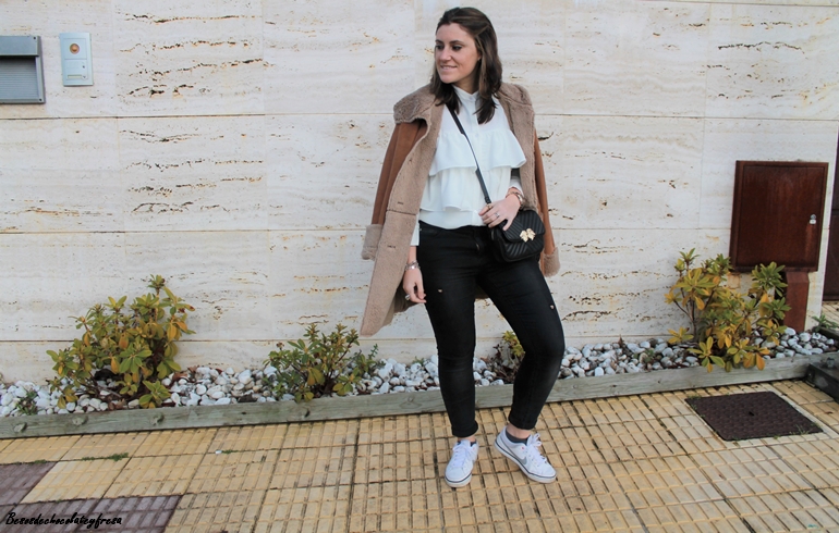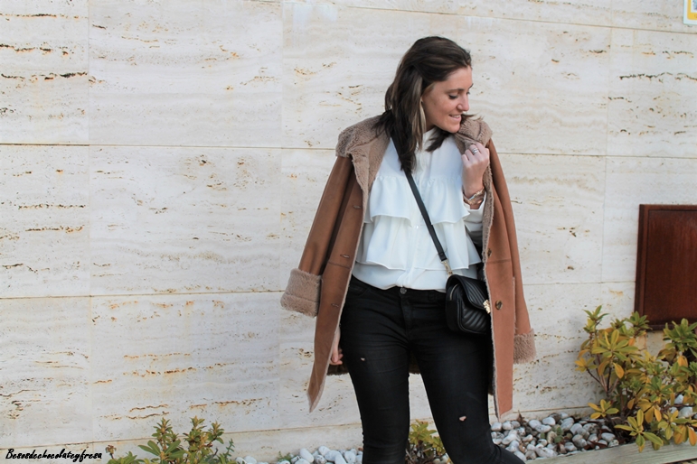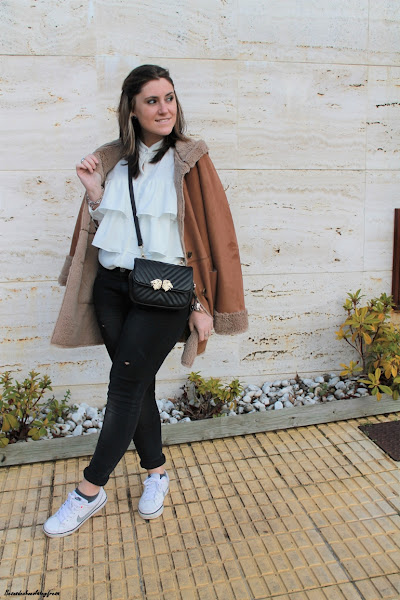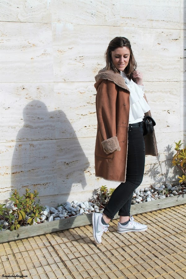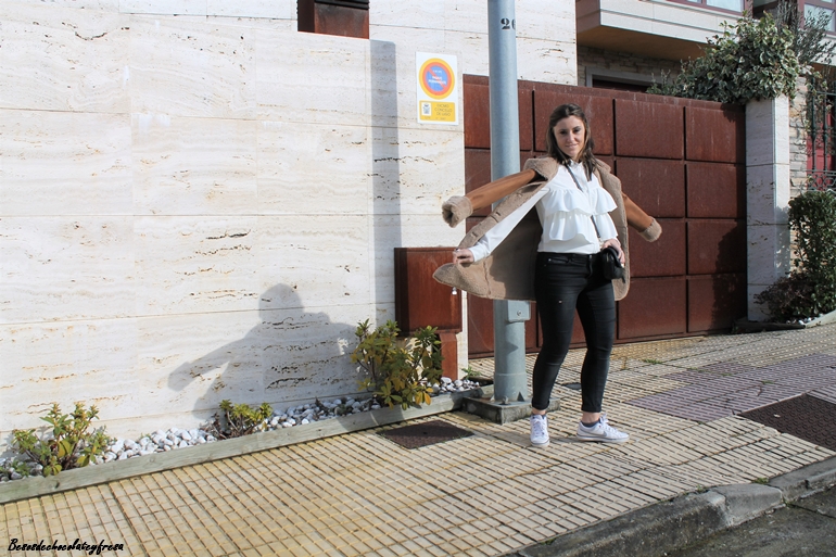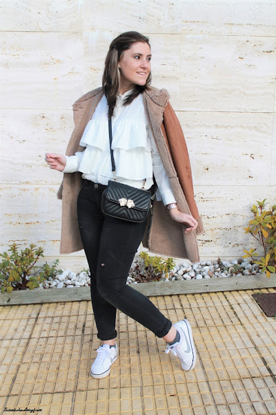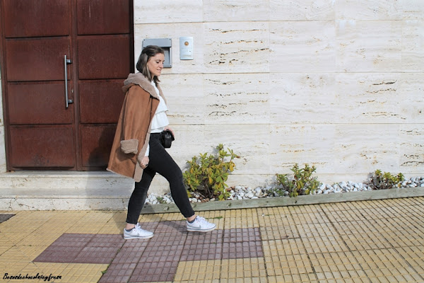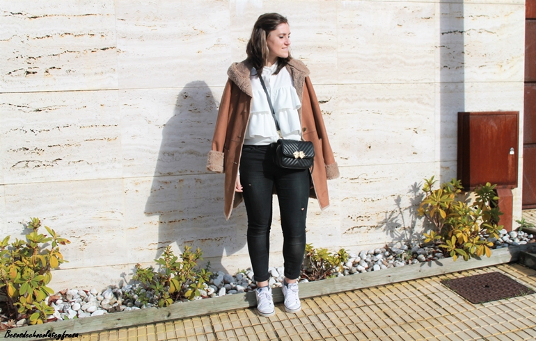 En el caso del look de hoy la combiné por unos jeans pitillos negros, pues la combinación del blanco y negro es muy acertada y elegante. Me decanté por un abrigo de tejido antelina y peluche en color marrón para conjugar junto con estos colores, sneakers y bolso bandolera en negro.