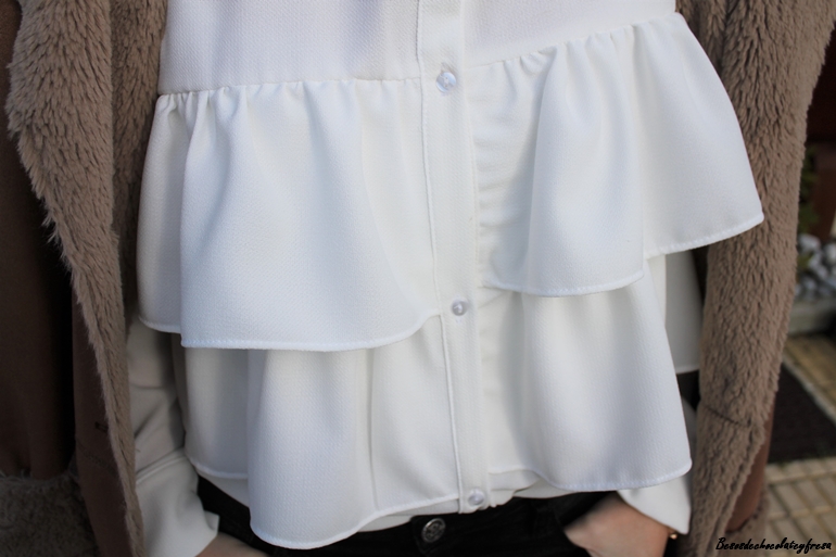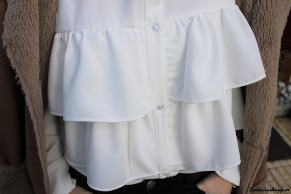Podemos hacer de una camisa blanca nuestro sello de identidad y llevar tanto en looks de día como de noche. Esta que os muestro en el outfit de hoy tiene el detalle de los volantes en la parte delantera que la hacen especial, de gasa y cuello mao.