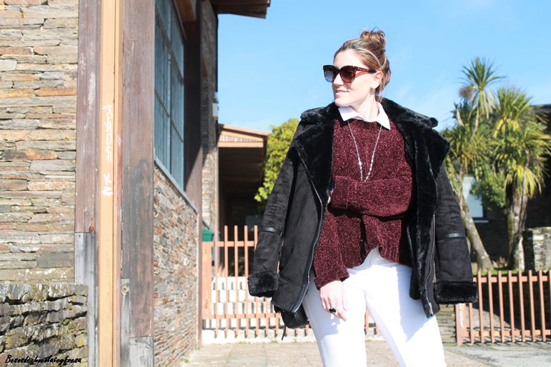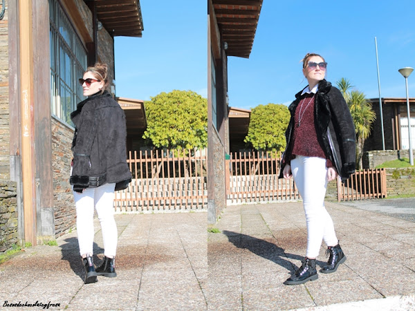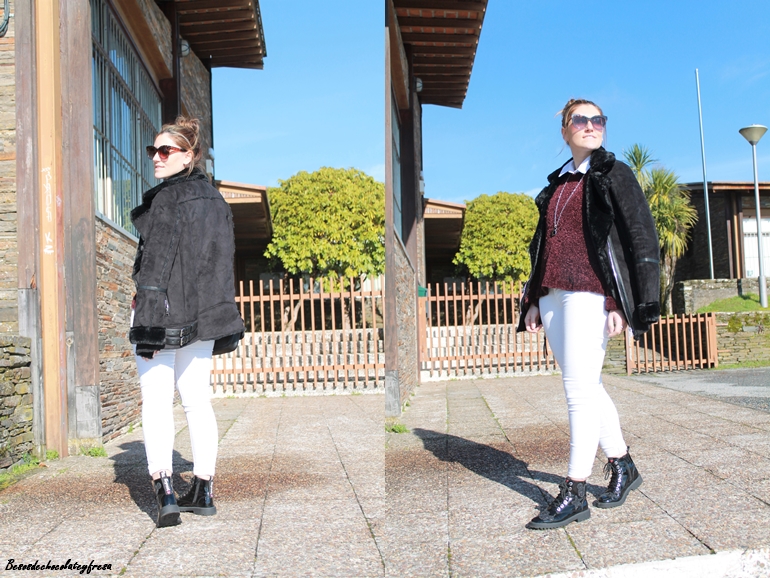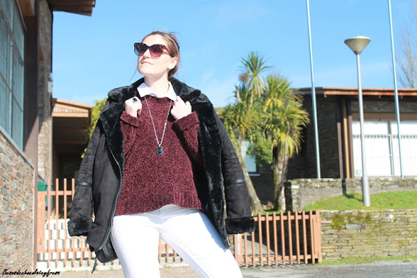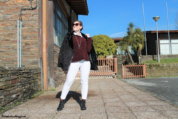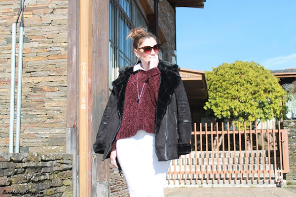 En este caso opté por combinarlo con tonos negros y blanco, en un sweater de color berenjena. Camisa blanca por dentro, jeans blanco y resto de complementos en negro como son los botines de charol y la cazadora de antelina y peluche.